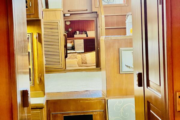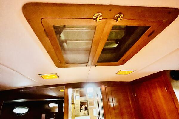 She is powered by a low-hour, 12-kw Fischer Panda that provides enough power to keep her three air conditioners, refrigerator, freezers, lighting, and other creature comforts operational. When not using the genny, you can rely on the 3-house battery bank of 3-8D’s and a single group 32 starting battery. At the dock, you can plug the 50-amp service from the bow or the stern as well as the city water tie in. If not tied into city water, she holds 200 gallons of fresh water.