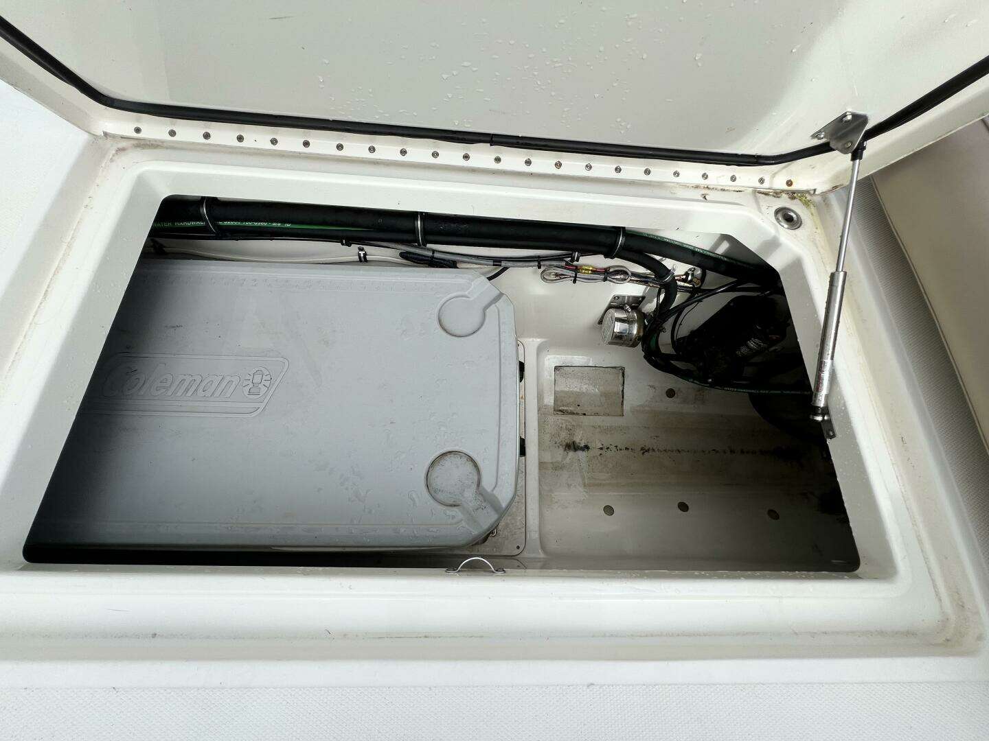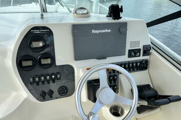The helm features a Raymarine HybridTouch multifunction display with integrated Radar, Chartplotter, and Fish Sonar, giving you clear visibility and control whether you’re chasing tuna offshore or cruising the coast.