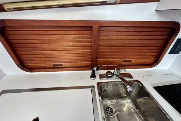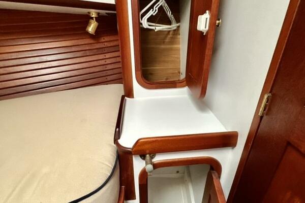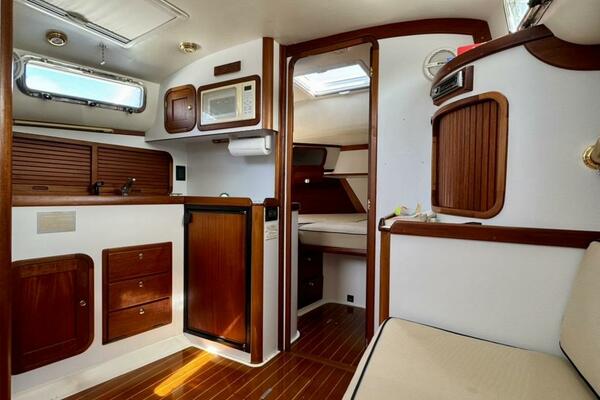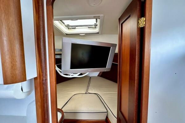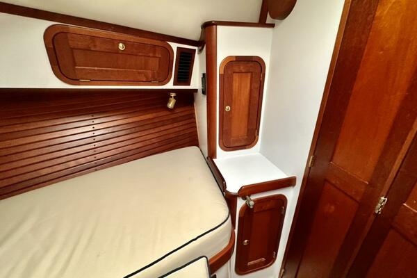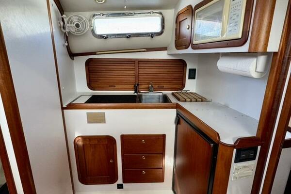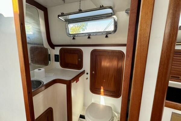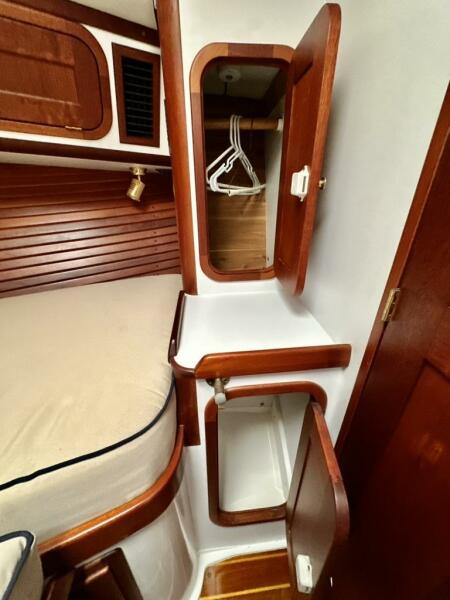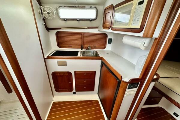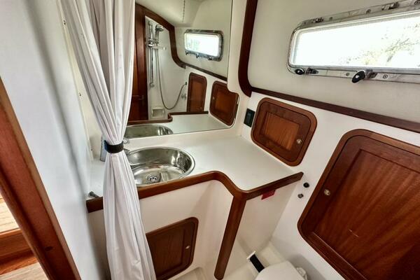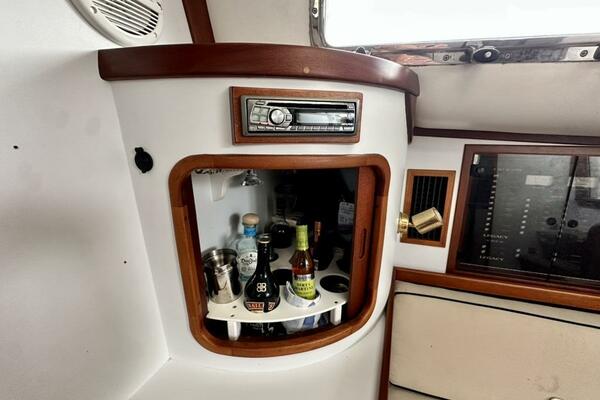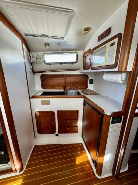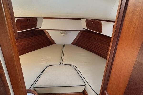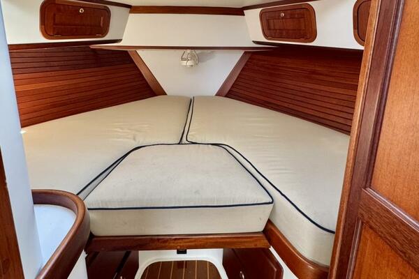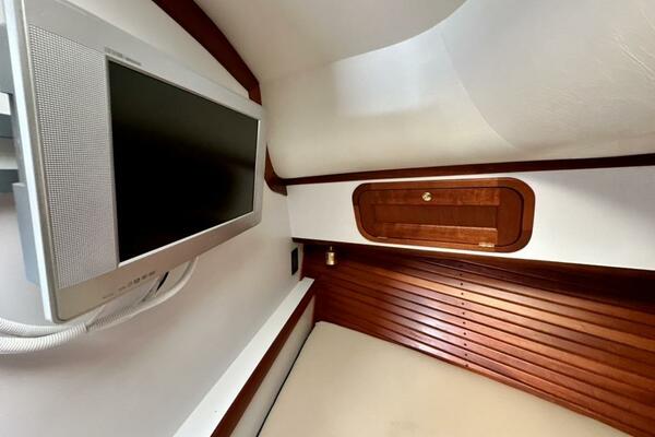 Below deck, the Legacy 34 Sport Express offers a warm and inviting interior finished with a traditional teak and cherry satin varnished interior. To starboard, an L-shaped settee provides a comfortable space for dining or relaxing, with the electrical panels conveniently located just outboard for easy access. The galley is compact yet well equipped, featuring all the essentials for cruising. Forward, a private cabin with a V-berth offers a cozy retreat and ample storage. The head includes a fresh-water toilet and shower. The entire cabin is climate-controlled with both heat and air conditioning for year-round comfort.