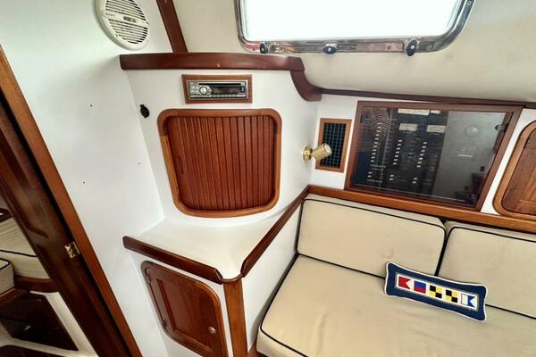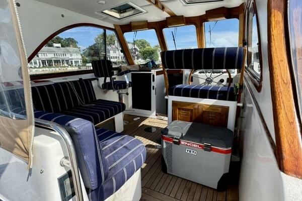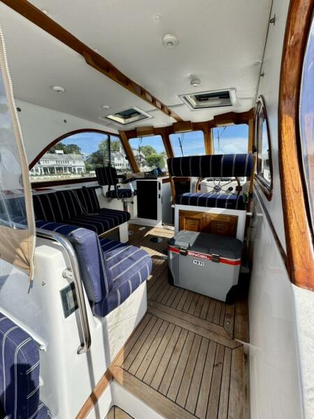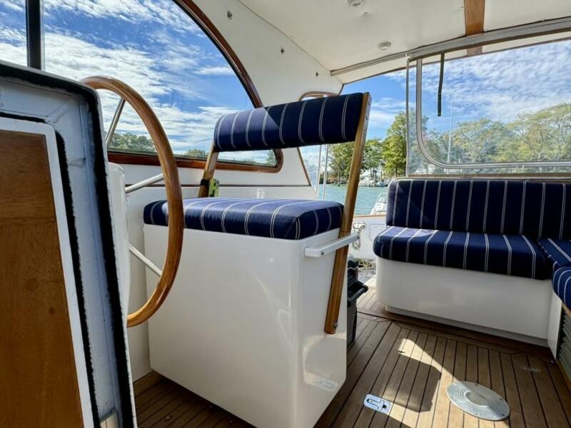 The pilothouse on BELLE is exactly what you need for a comfortable family cruiser. All upholstery re-done in 2023, the space is comfortable, attractive and accommodating.