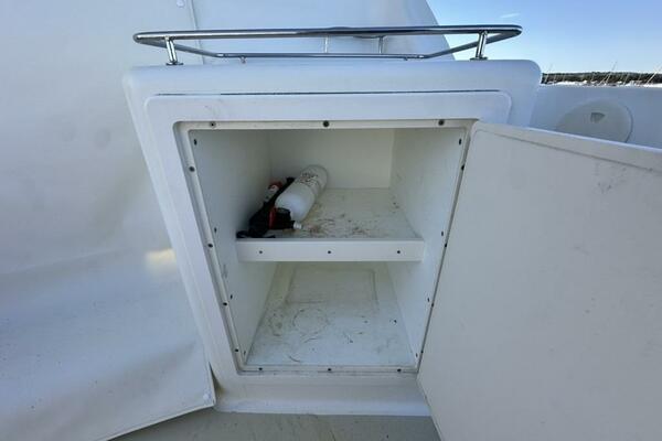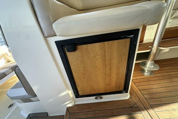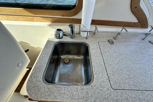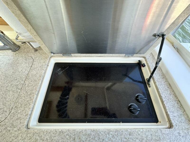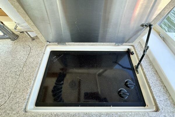 Aft of the helm seat is the galley, which has a two burner Princess electric stove (under a hinged cover), a Stainless Steel sink with faucet, Corian counters, 4 drawers, a shelved locker, and a Dometic microwave. There is a Dometic fridge with freezer in this area (and a second fridge in the cabin).