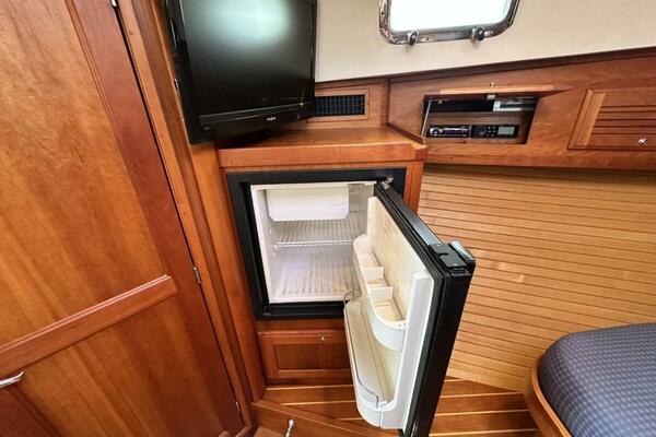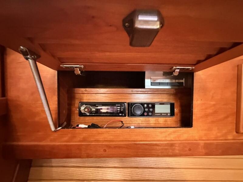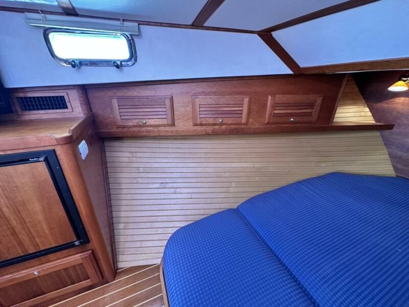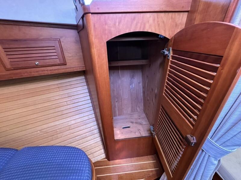 The master electrical panel and other electrical controls are above the aft section of the settee, behind hinged doors. Opposite to port is the head, with sink, vanity, Jabsco Electric head, and a separate stall shower, There is a wet locker with coat hooks outboard of the shower, and storage outboard of the vanity and below the vanity. A cherry framed mirror is above the vanity. There is a polished stainless opening port in this area, as well as an overhead hatch.