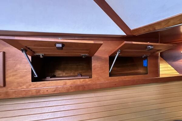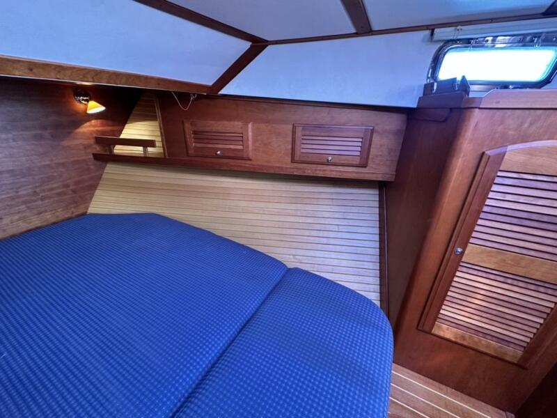 Going down the steps (which are not steep, and are hinged for additional storage) to the salon, one finds an L-shaped settee to starboard, with a cocktail height cherry table that can be used with a fitted cushion to expand the settee as a berth. There is generous storage both behind and below the settee, as well as cabinetry and a book shelf above the settee. There is a large polished stainless opening port above the steel, as well as a hatch in the overhead. Two glass shaded reading lamps are above the settee, in addition to the overhead lighting.
