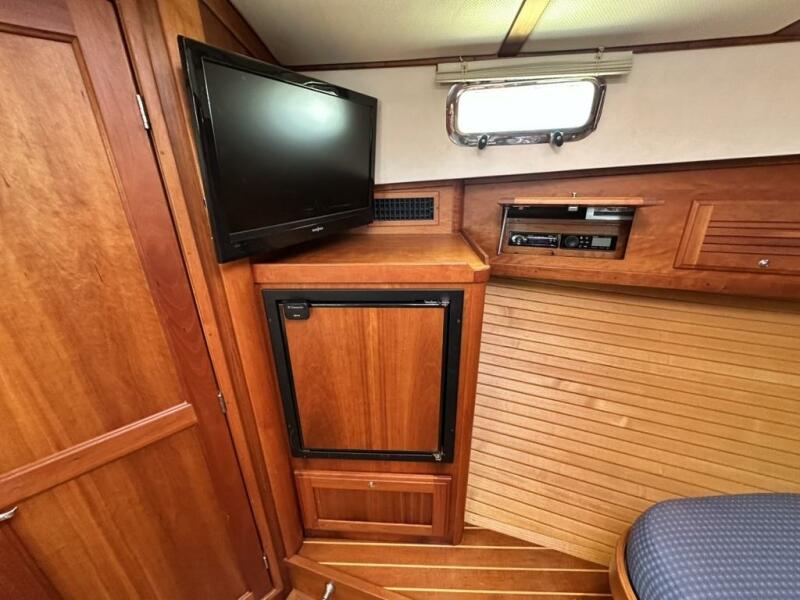 Forward of the head is a raised cabinet with the second fridge in it. Above this is the Insignia Television, on a swivel mount so that it can be seen from wither the forward berth or the salon settee. The large centerline berth is raised, with easy access from either side. There are two glass shaded reading lamps ar the forward end of the berth. Four drawers are foundbelow this berth, and five cabinets are lining the hull to Port (3) and starboard (2). There is also cedar lined hanging locker one the starboard side.