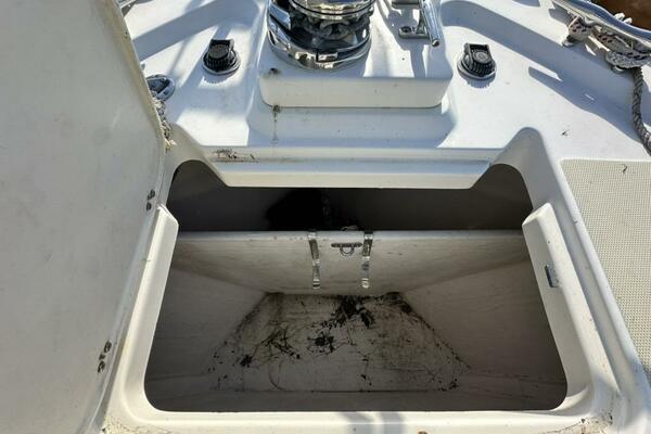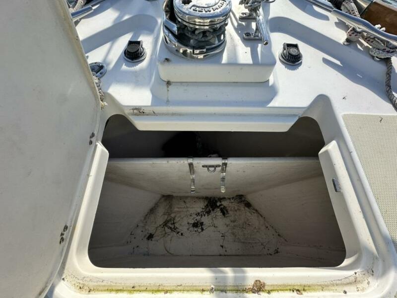 The side decks are quite wide, and the bow rail extends well aft, so one feels quite secure moving forward. The bow rail extends out around the anchor platform. There is a large locker aft of the chain locker, accessed from the foredeck. In the cockpit one finds storage under the aft facing seat and in a cabinet to starboard. A large hinged panel opens in the cockpit sole to accrue access to the bilge and a vast storage area.