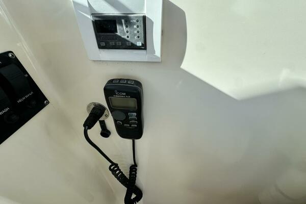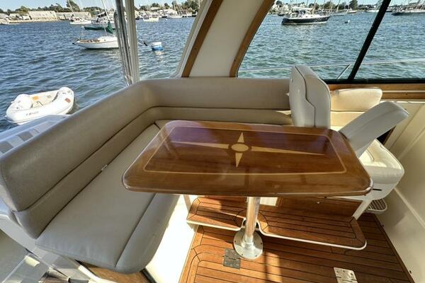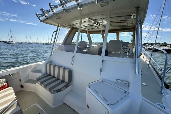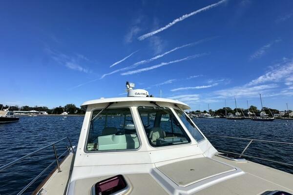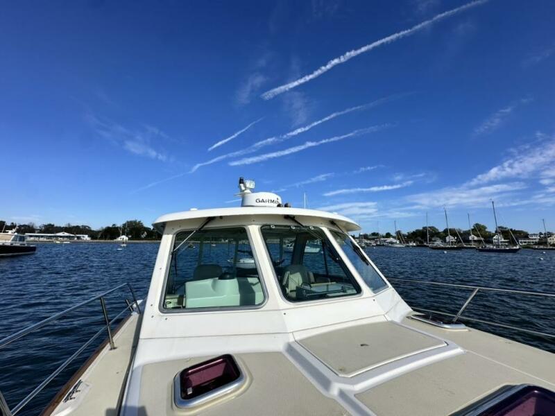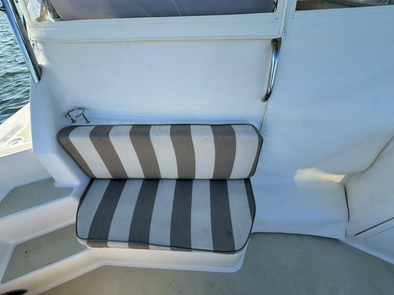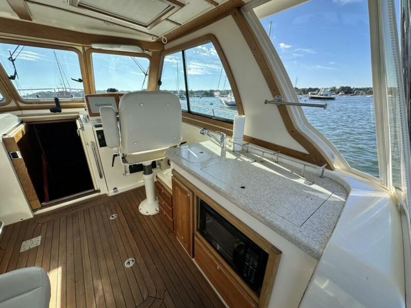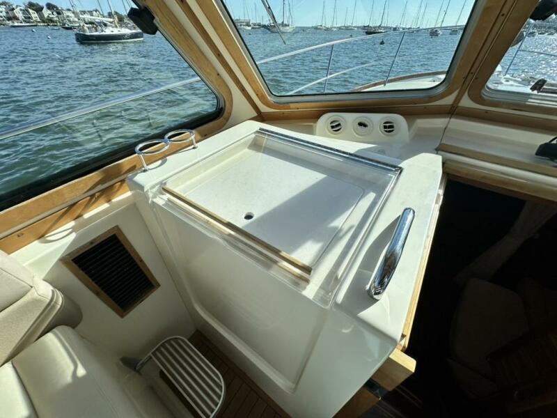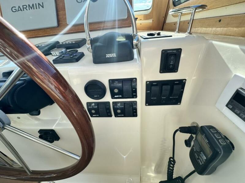 Ventilation is provided by two sliding side windows, two overhead hatches (with OceanAir screens and sun blocks), and an electric opening center windshield. The Pilothouse has a dedicated air conditioning/heat unit with a control near the helm.