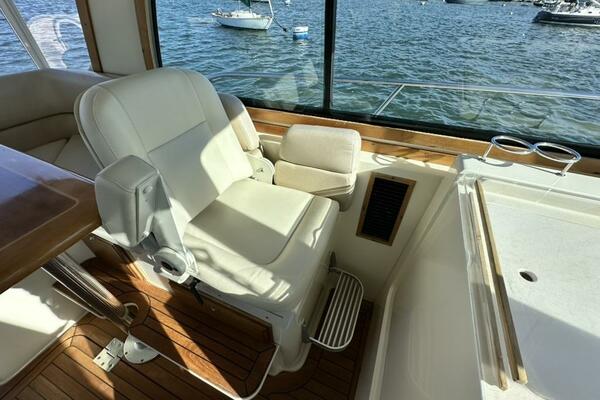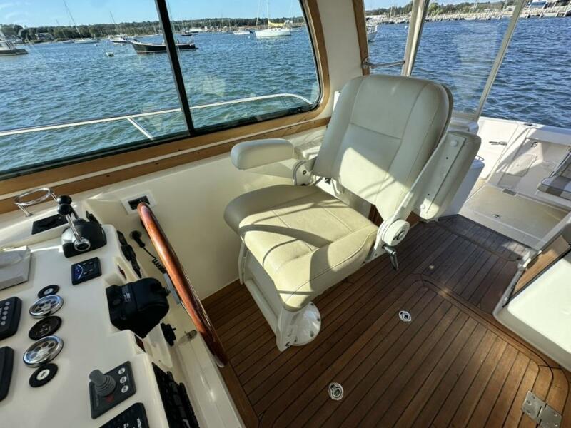 The pilothouse is a great arrangement, and includes separate Stidd seats for the helms person and their "companion". The helm seat is a pedestal version with armrests and a folding foot rest. The port seat is a fixed mount with a sliding back, which allows the settee behind it to be extended. There is a folding foot rest for this seat too.