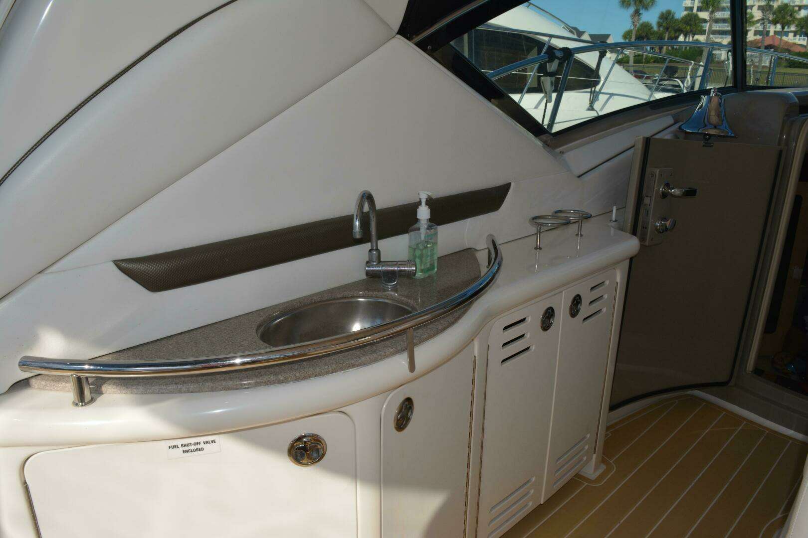 - Cockpit: A spacious and comfortable cockpit includes wraparound seating, a wet bar, and easy access to the extended swim platform.