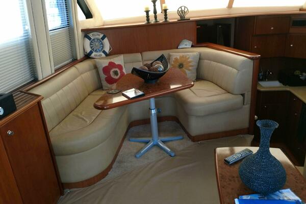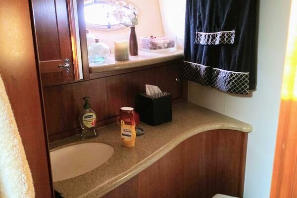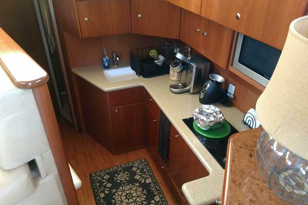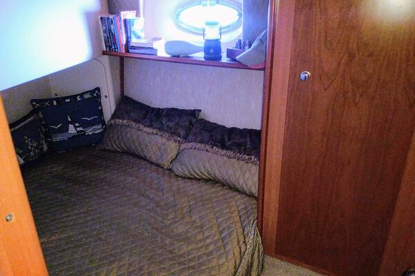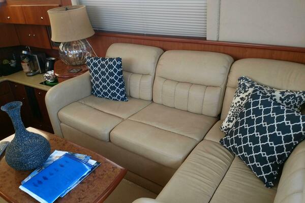 The great interior layout has two staterooms and "split" head and shower compartments for convenience. The salon/dining area has large windows on all sides giving it a "great room" affect. The large galley is filled with cabinets and drawers and has a Corian countertops. She's equipped with a flybridge hardtop, bow thruster, anchor windlass, spotlight, full electronics, walk-thru transom door, large swim platform and more. Powered by twin dependable Yanmar 440hp diesels with approx 500 original hours.