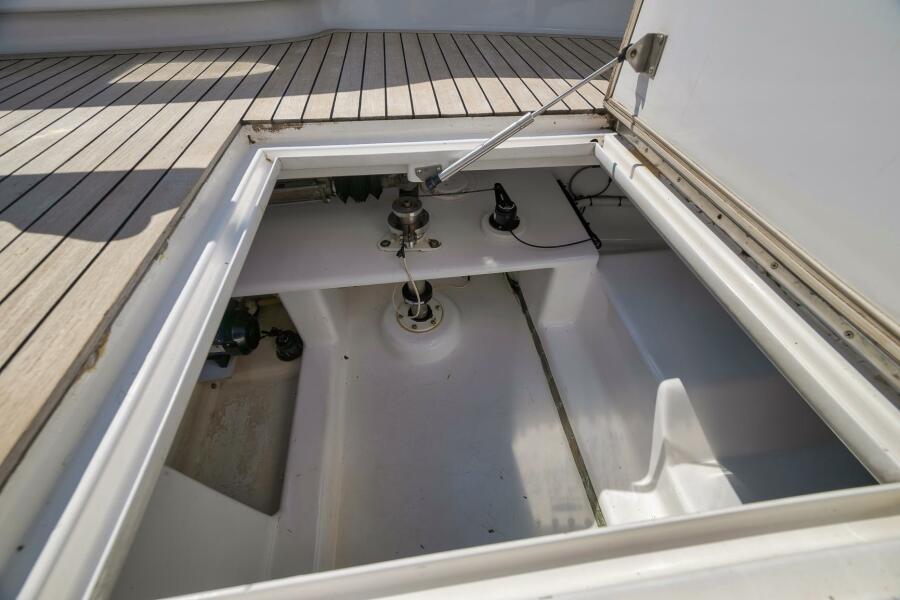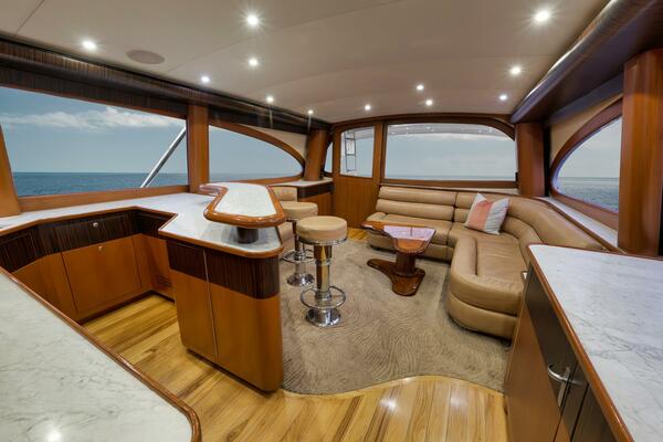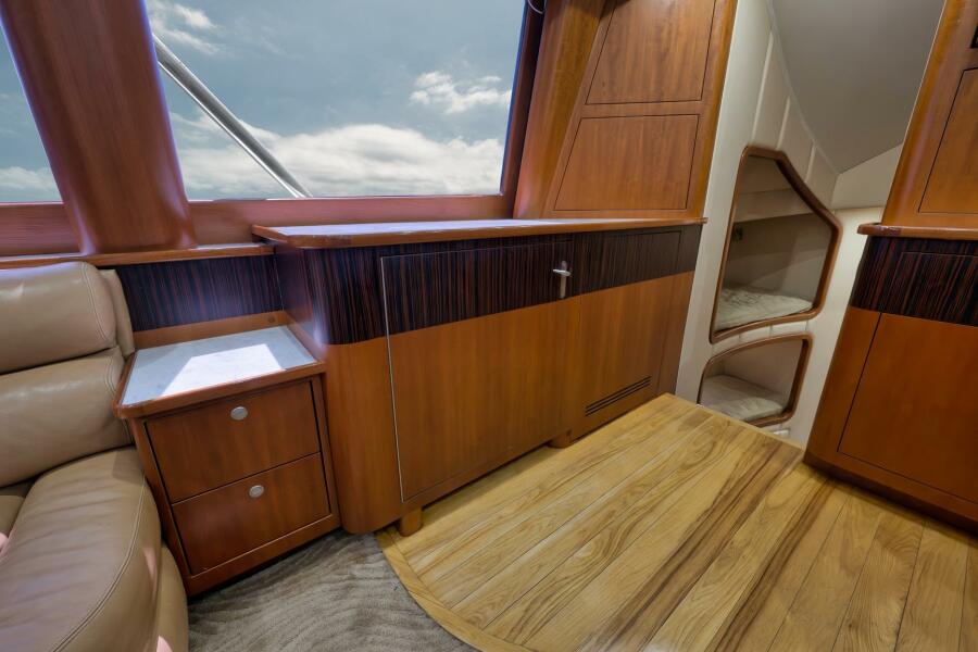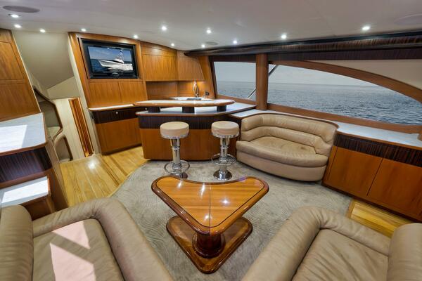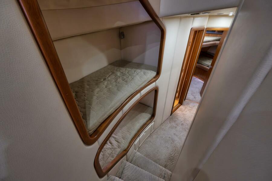 Entering the salon you will find a large spacious layout with beautiful wood finishes, two custom leather sofas, and a large teak coffee table. Moving forward to the galley, this area has custom stone counter tops, a custom bar top with high polished stainless steel bar stools, roomy custom refrigeration drawers, and freezer space. Moving down the companionway to the port are two over/under berths with personal TVs and receivers. Continuing forward to starboard is the master suite with a full size queen berth, dressing area, and love seat. The master also houses a full ensuite head with shower, teak vanity, and onyx counter tops. Next moving forward is the day head with a full shower. Forward to the bow area is the forward stateroom with two spacious over/under berths. This room is very private for a couples excursion. This vessel is equipped with the latest sonar and two seakeepers.