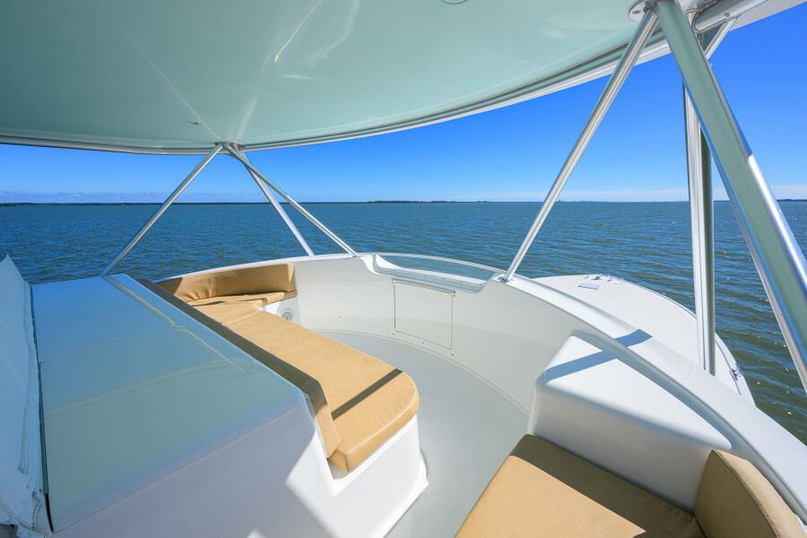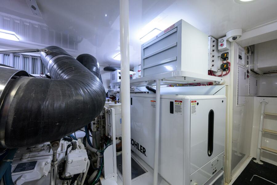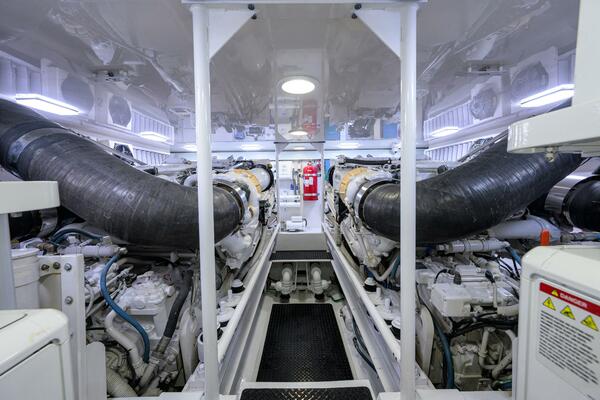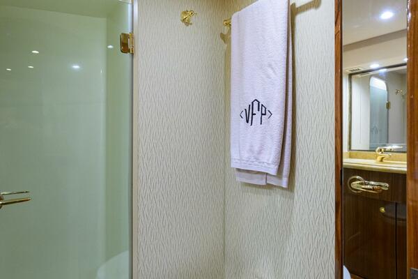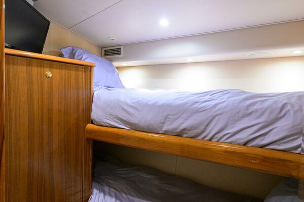 This 64' Viking has the preferred 4-stateroom, 3-head layout with galley up and dinette forward of the salon. The high-gloss Viking teak cabinetry is in nice condition, and this boat was originally a custom order vessel with extra wood interior details throughout. The forward VIP stateroom has crisscross berths with a larger double to the starboard side and a good-sized twin berth just above to portside. There is a TV with Blu-ray player on the forward bulkhead with cove cabinets outboard above the starboard berth. Loads of storage beneath the berths and a cedar lined hanging locker just aft of the port berth. Past the hanging locker is entry to the private VIP head with granite vanity top, marble sole, and large shower stall. Moving back on the starboard side is the guest stateroom with upper and lower twin berths with a TV, hanging locker, and drawer storage beneath the lower berth. On the companionway is a shelved linen/closet across from the washer/dryer closet. Next aft to port is the guest head which has a door to the companionway/doubling as your day-head, and a door to the side-by-side twin berth guest stateroom further aft. This guest head has a dark green granite vanity top with marble sole and large shower stall. The aft guest stateroom has a TV, large hanging locker, cove cabinets outboard, and two steps down to the berths with a center nightstand and drawer storage. Across to the portside is the Master Stateroom with nicely arranged diagonal walkaround queen berth. There are nightstands to either side plus a three-drawer dresser forward and a four-drawer dresser aft. Above the aft dresser is a larger TV and Blu-ray player. Outboard is a dual door large closet. Beneath the berth is easily accessed storage. Just forward is the private master head with granite vanity, marble sole, mirrored medicine cabinet, and extra-large, glass door shower compartment. All staterooms are carpeted, all the heads have white oval porcelain, undermounted sinks, each head has different custom colored granite, and the MSDs are all freshwater Headhunter. Also, all the air-conditioning units (5) were new in mid-2023.