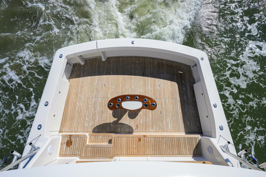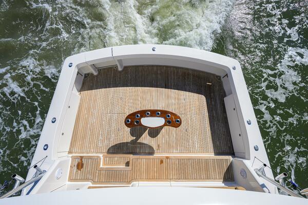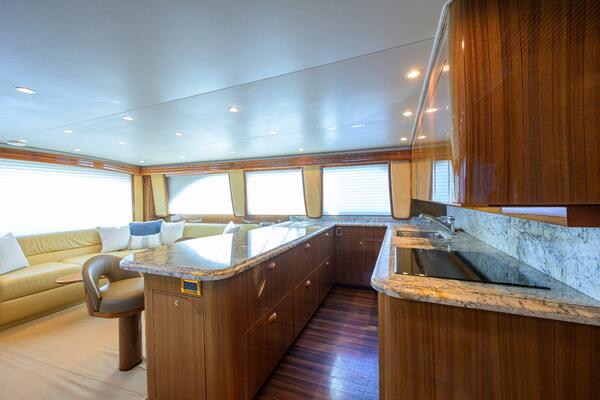 The Galley has granite countertops and backsplash with an Amtico Rosewood laminate sole. A large stainless sink and 4-burner electric stovetop are on the forward counter with indirect lighting beneath the cabinets above. Lots of storage and a microwave/convection oven hidden in the cabinet. Three Sub-Zero dual drawer units are beneath the aft countertop which overhangs with a couple of plush cushioned swivel barstools on the salon side. The Salon surround has wood valances, wood with inlayed fabric lambrequin boards, and Hunter Douglas silhouette blinds. A large U-shaped dinette is forward to starboard with a custom wood-top table. Above on the forward bulkhead is a large Samsung TV. L-shaped Salon settee and the dinette were both reupholstered in 2018 and have decor pillows. The salon has a wood triangular cockpit table. A brand-new tailored canvas runner covers the salon carpeting. The Rosewood laminate flooring is also on an entry landing by the electric slide opening salon door. The cabinets to the starboard side of the salon door house the main electrical breaker/switching panel, the A/V equipment center, and a drink ice cube maker.