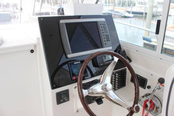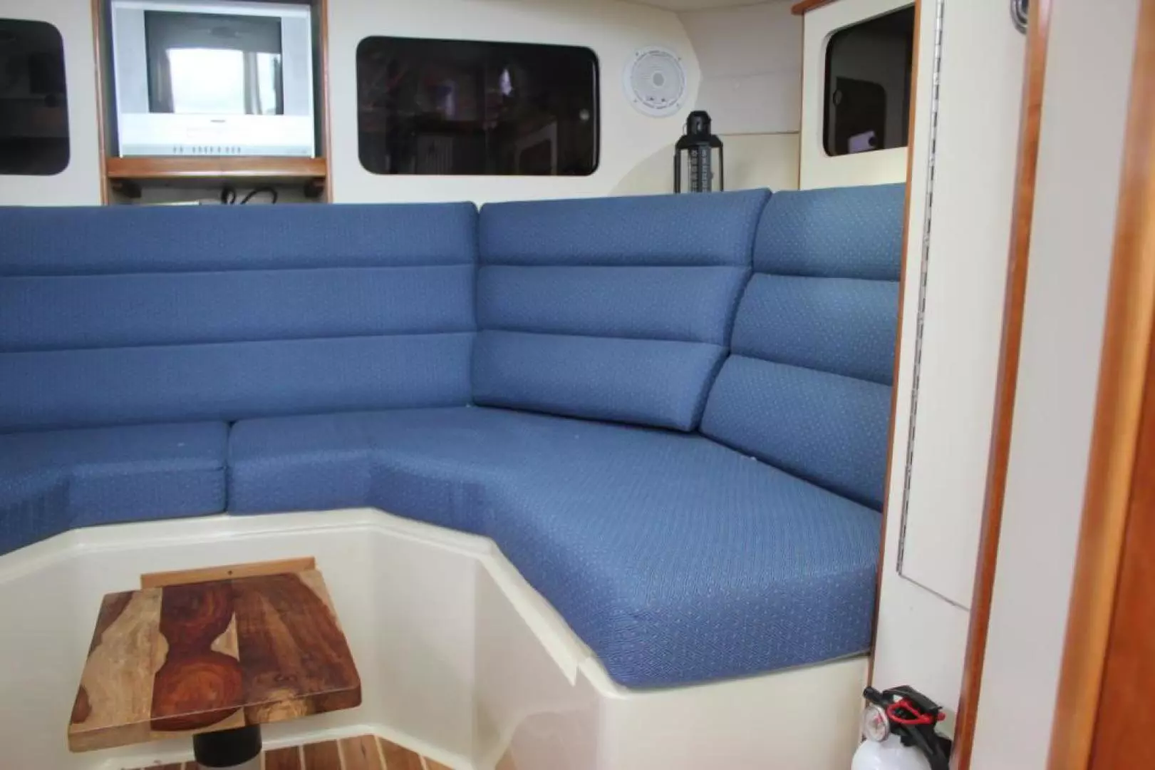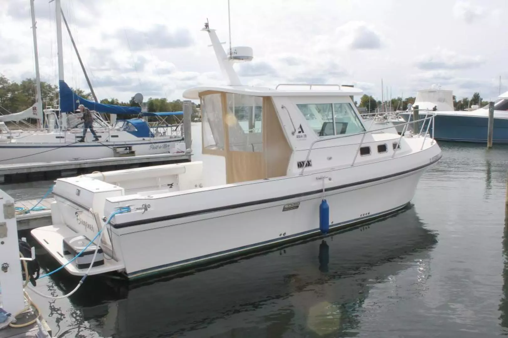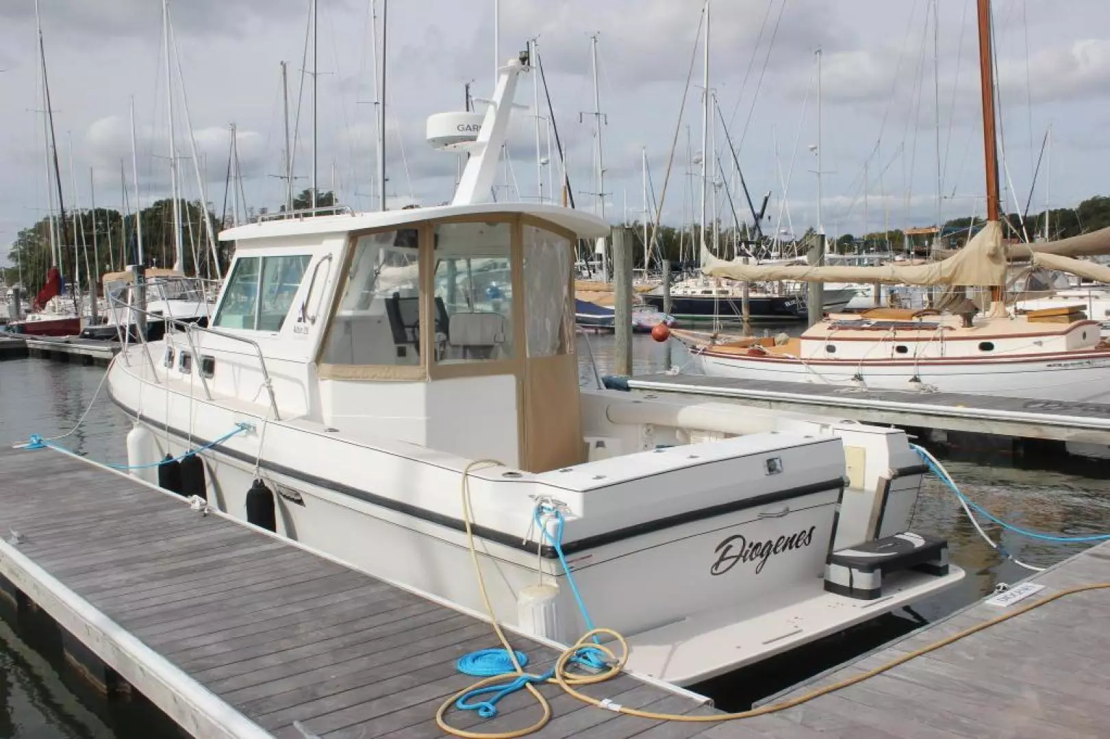 Diogenes features seating for five, turning the wheelhouse into a comfortable saloon. This area is enclosed by the optional hard enclosure. The seating can be converted into a berth allowing her to sleep 4 adults comfortably. She has the optional flip down seat for the transom and transom door for easy boarding. Below decks the quarter berth gains height so that the occupant can sit upright. The interior has fine wood appointments. She is a versatile, rugged, offshore boat. The skeg keel led Power Boat Reports to call the 28TE the finest tracking boat of any size tested to date. She is powered by a 315-HP Yanmar diesel with 975 hours. Couple her diesel power, bow thruster and economical operation she sacrifices nothing to a twin-engine design in terms of maneuverability. Check out the Full Specs and call for an appointment to see her.