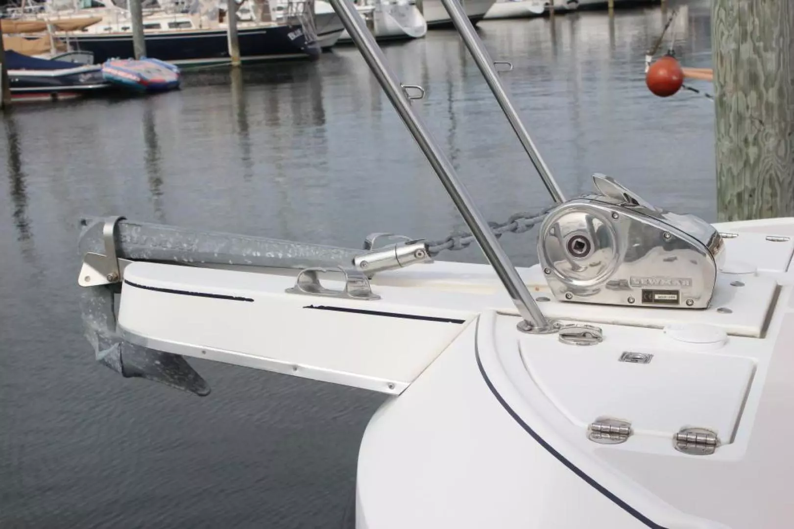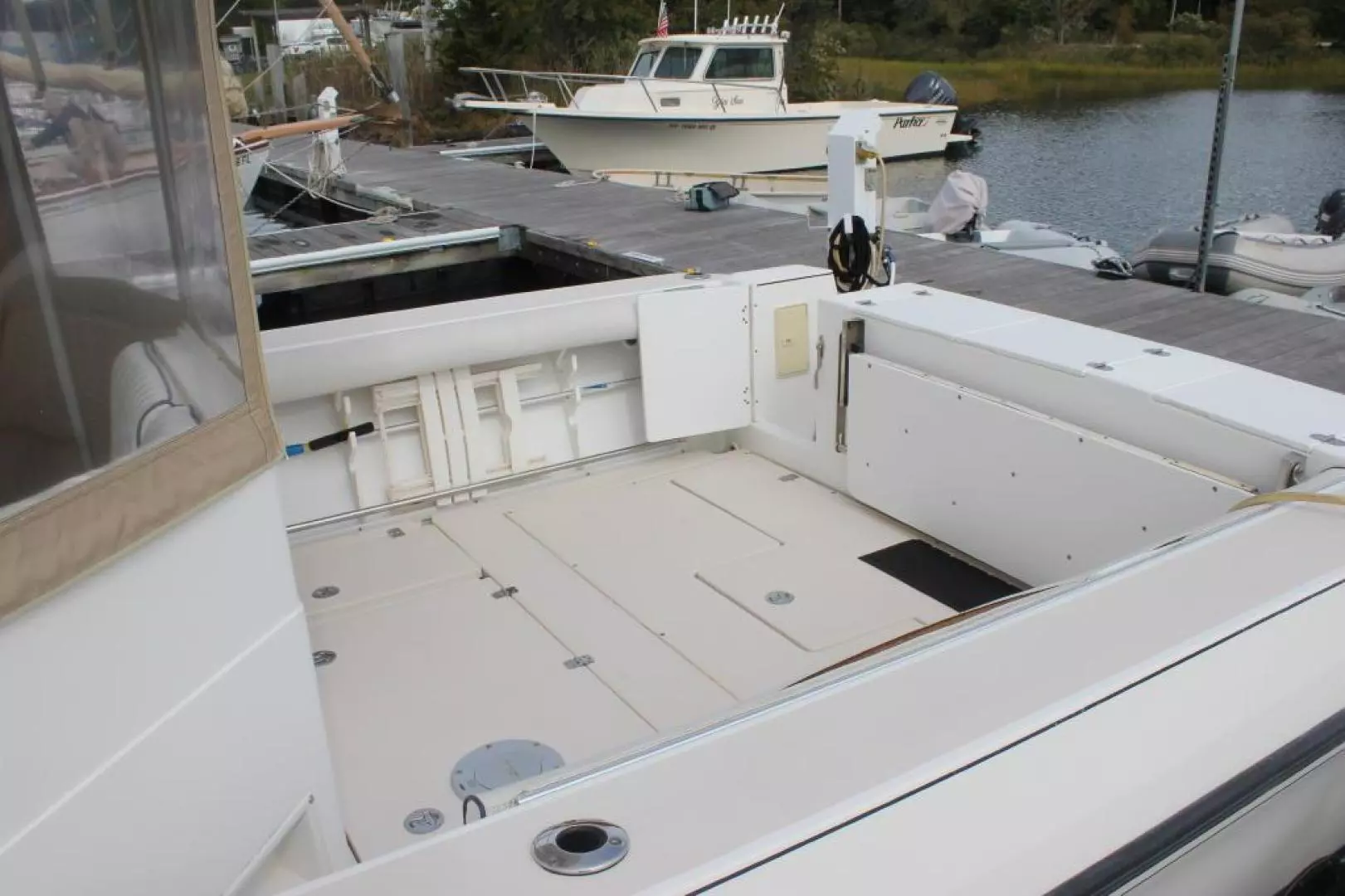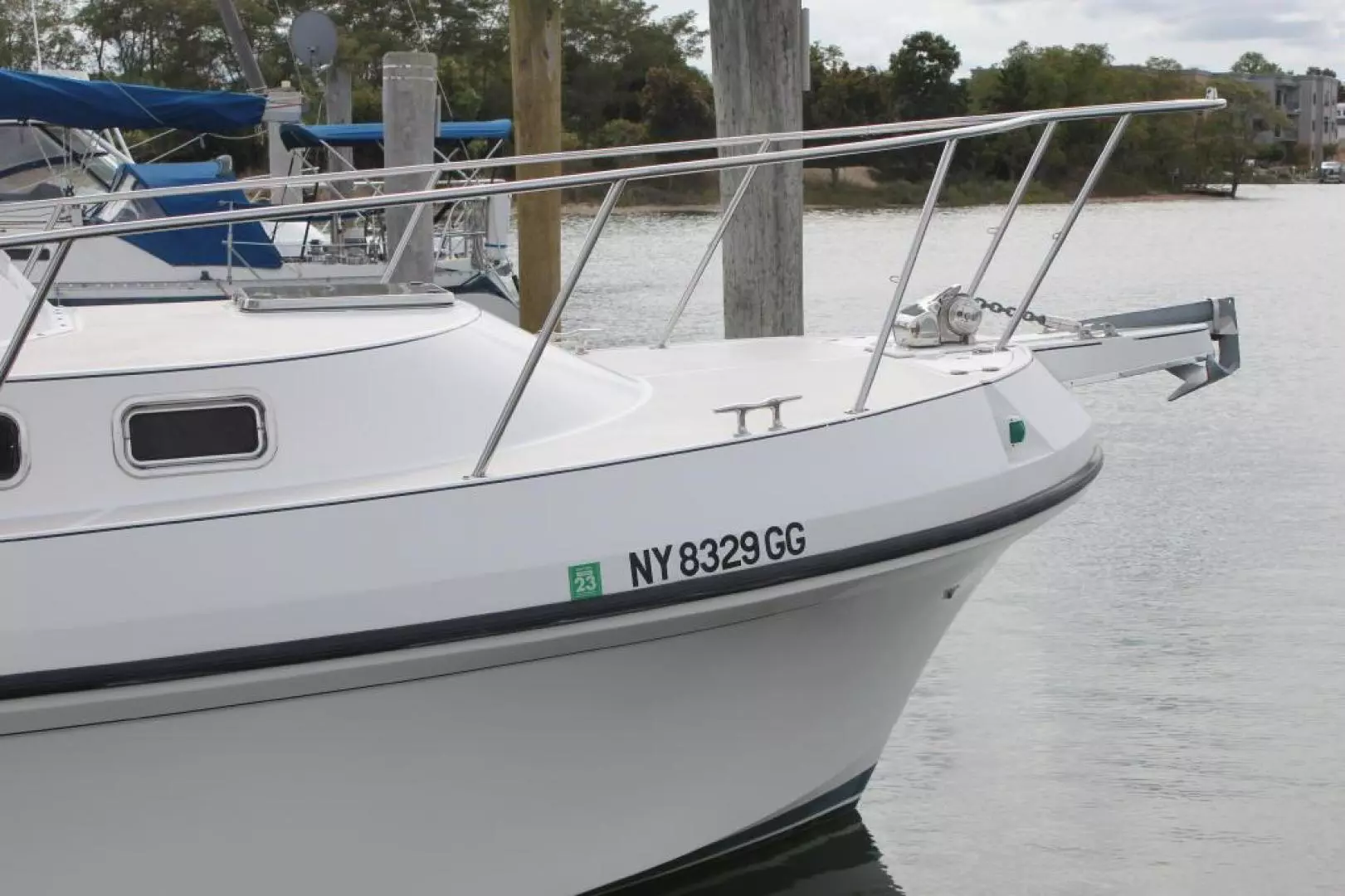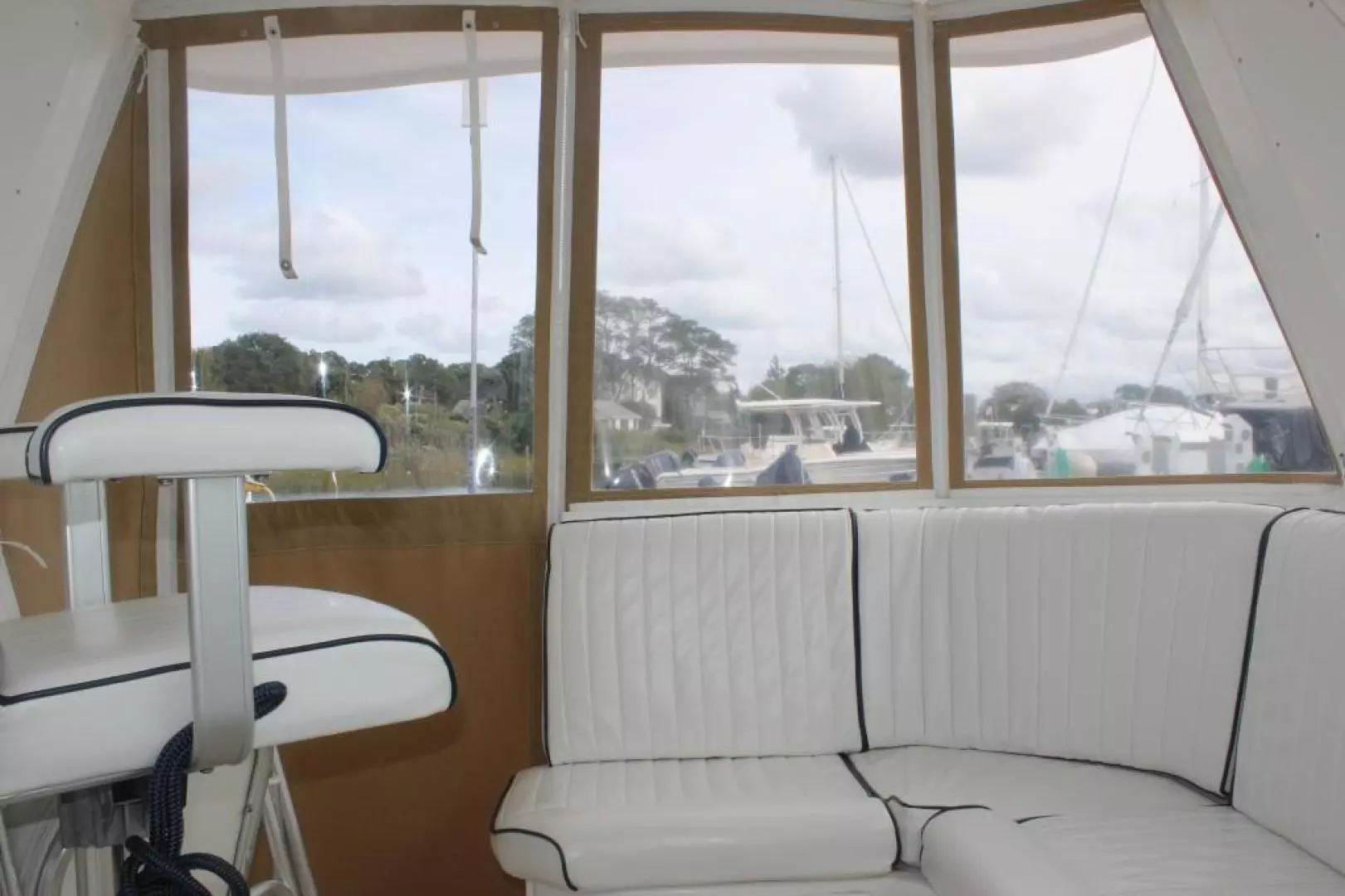 Diogenes features seating for five, turning the wheelhouse into a comfortable saloon. This area is enclosed by the optional hard enclosure. The seating can be converted into a berth allowing her to sleep 4 adults comfortably. She has the optional flip down seat for the transom and transom door for easy boarding. Below decks the quarter berth gains height so that the occupant can sit upright. The interior has fine wood appointments. She is a versatile, rugged, offshore boat. The skeg keel led Power Boat Reports to call the 28TE the finest tracking boat of any size tested to date. She is powered by a 315-HP Yanmar diesel with 975 hours. Couple her diesel power, bow thruster and economical operation she sacrifices nothing to a twin-engine design in terms of maneuverability. Check out the Full Specs and call for an appointment to see her.