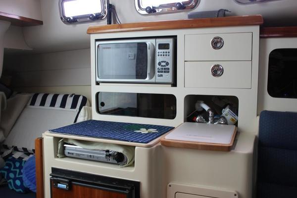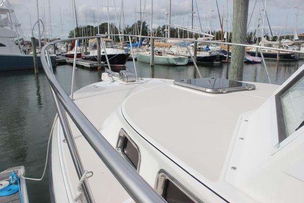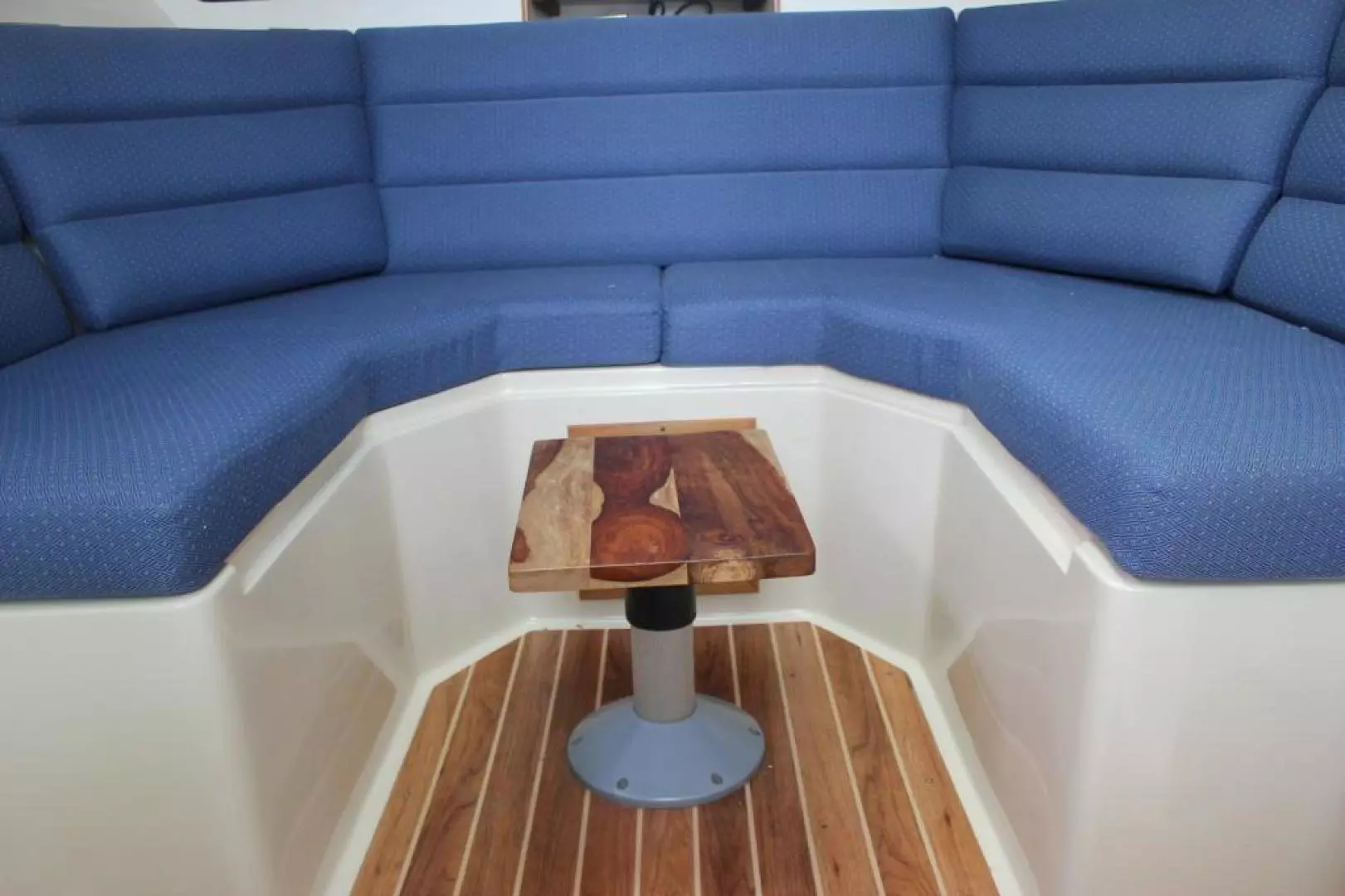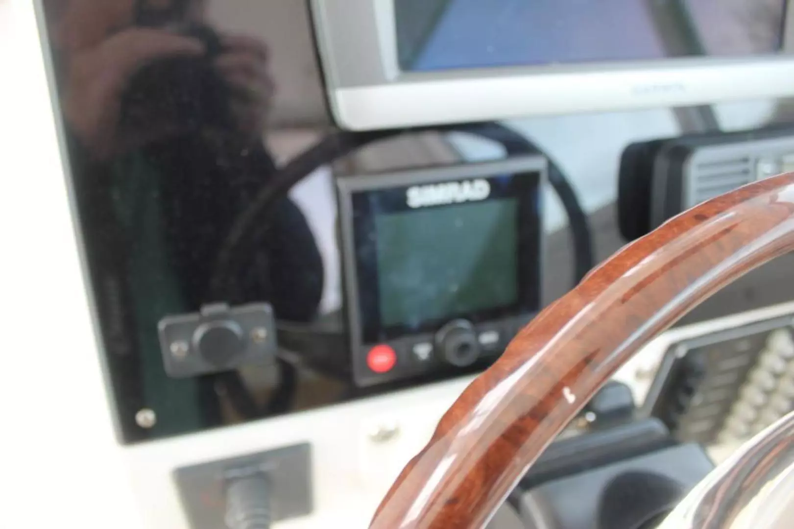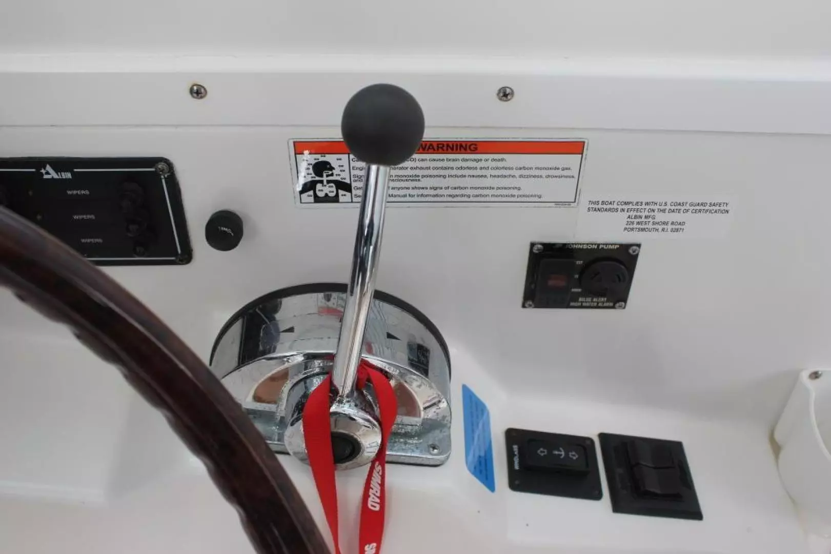 Diogenes features seating for five, turning the wheelhouse into a comfortable saloon. This area is enclosed by the optional hard enclosure. The seating can be converted into a berth allowing her to sleep 4 adults comfortably. She has the optional flip down seat for the transom and transom door for easy boarding. Below decks the quarter berth gains height so that the occupant can sit upright. The interior has fine wood appointments. She is a versatile, rugged, offshore boat. The skeg keel led Power Boat Reports to call the 28TE the finest tracking boat of any size tested to date. She is powered by a 315-HP Yanmar diesel with 975 hours. Couple her diesel power, bow thruster and economical operation she sacrifices nothing to a twin-engine design in terms of maneuverability. Check out the Full Specs and call for an appointment to see her.