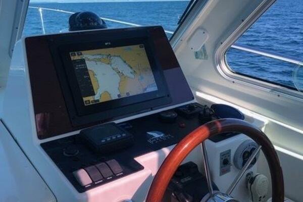 Sandpiper has a new Raymarine Axiom plotter. Bow & stern thrusters. Solar panel. Electric Sure Shade telescopic bimini supports plus a cockpit enclosure. Reverso oil change system.