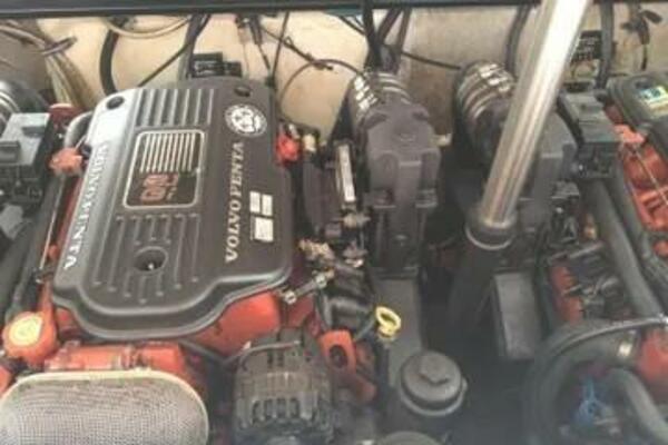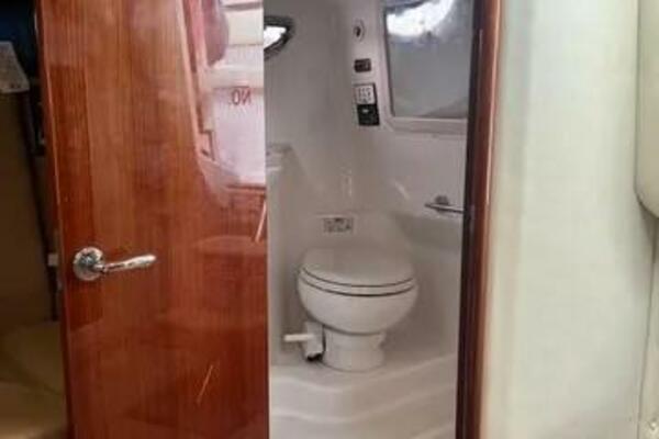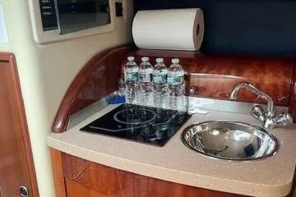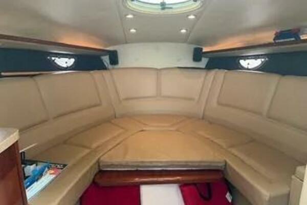 In the 323 cabin with its huge U-shaped lounge, the seating and sleeping are accommodating and comfortable, the head and shower inviting, the galley welcoming and accessible. In the cockpit, a flip-out table hides in the portside sidewall, ready to swing with just a touch out and up for a quick bite to eat. At the entrance to the cabin opposite the centerline door, a handy stainless ladder slides in-and-out for quick access to the bow. The cockpit galley finds room for a fridge in addition to the stove and sink. At the helm, seating is flexible and comfortable, ready to add more room as the back rests flop forward for a friend to sit nearby. Sternward, the cockpit seating links with the sunpad for ideal use of space there. But the 323 also speaks to boaters sense of style.There is stainless steel absolutely everywhere on the 323, from the windlass plate to the optional and very aggressive arch to the heavy, stamped engine vents. Vessel has a generator and bow thruster.