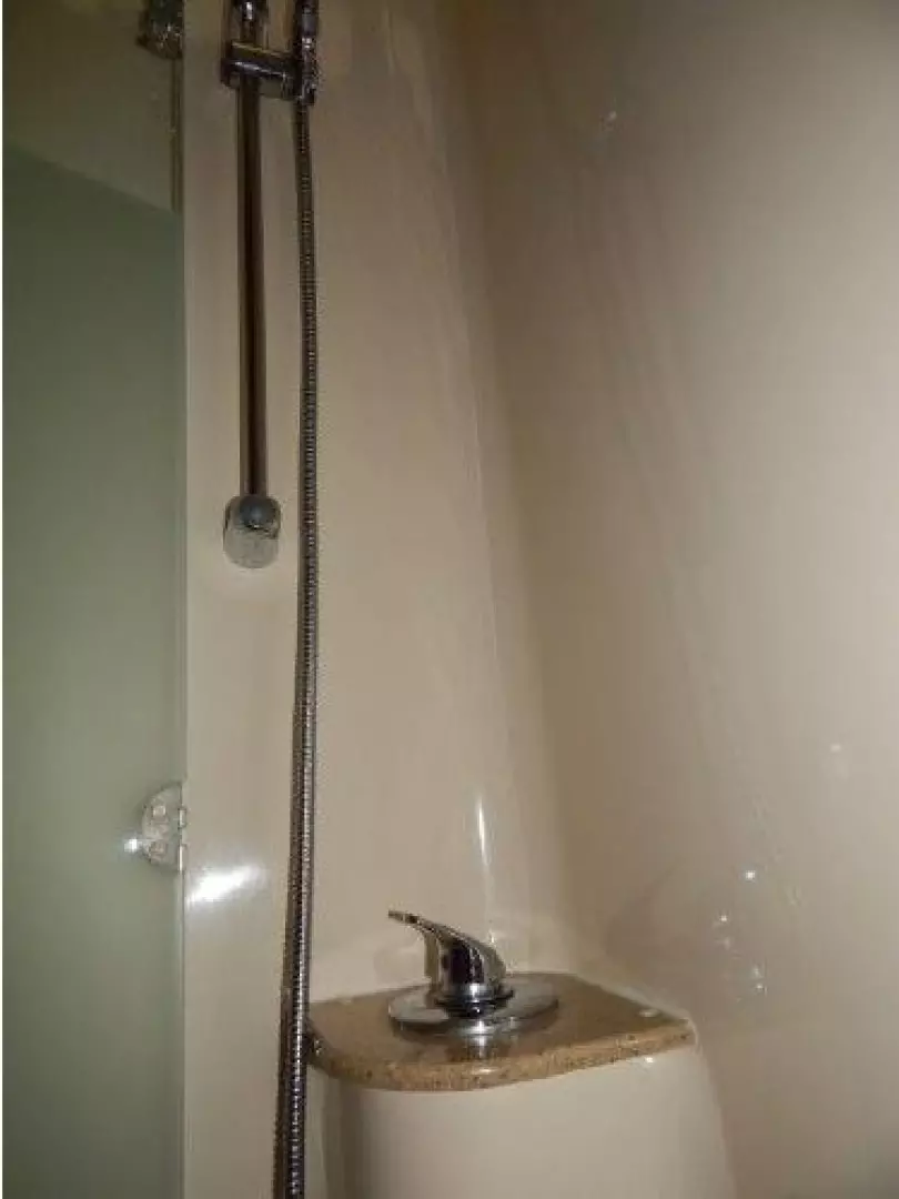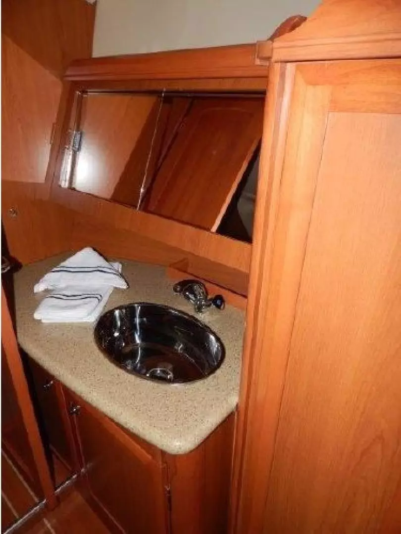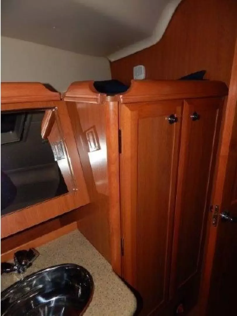 Furthest forward is the guest stateroom with a pullman berth, innerspring mattress, hanging locker, ample storage, vanity sink and ensuite head.