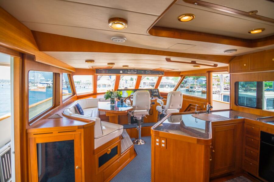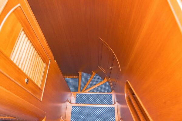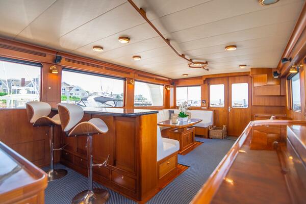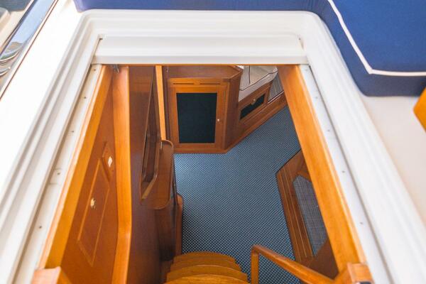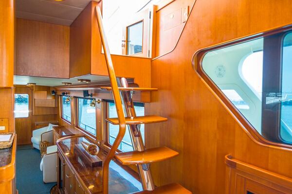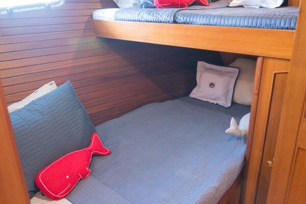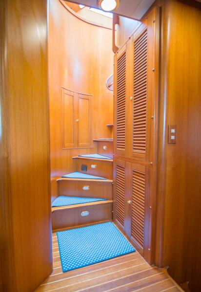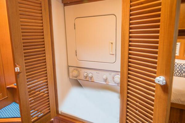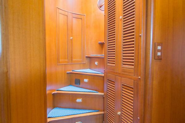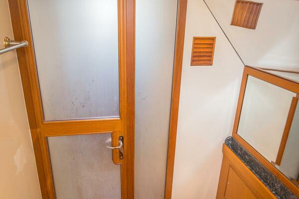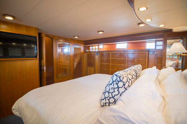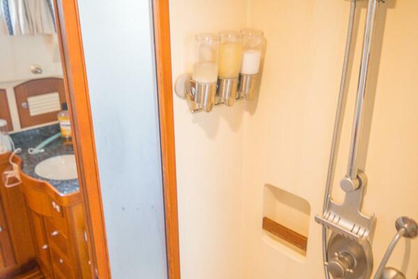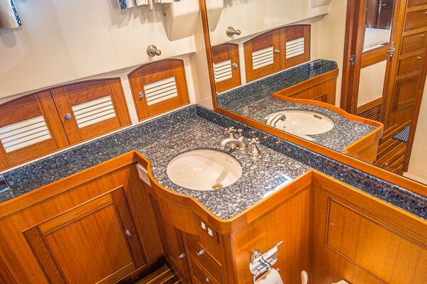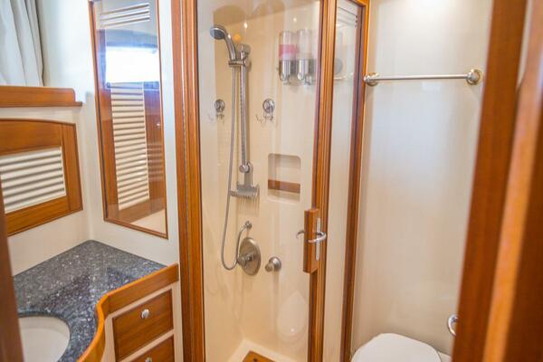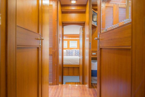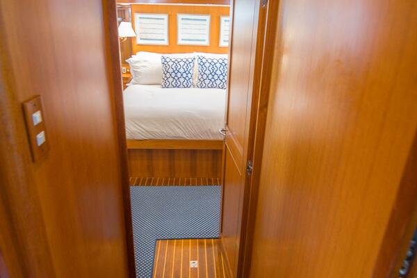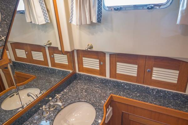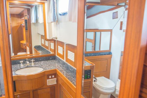 The full beam master is huge with full 6'4" headroom, teak and holly sole highlighting the teak interior. She has an island king berth with drawer storage under the berth in addition to dressers port and starboard. There are portlights with Shoji screens, night lighting around the berth as well as behind the valances. The master stateroom offers a lady’s vanity table with mirror and swing-out seat. The en-suite his and hers head is spacious with a large shower room in between two sink vanities with granite countertops and several drawers and lockers with shelves for storage of toiletries, linens, etc.