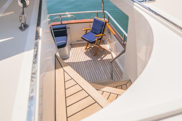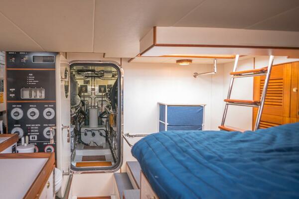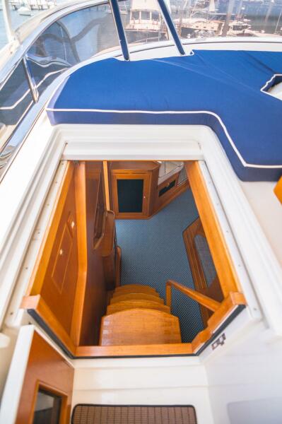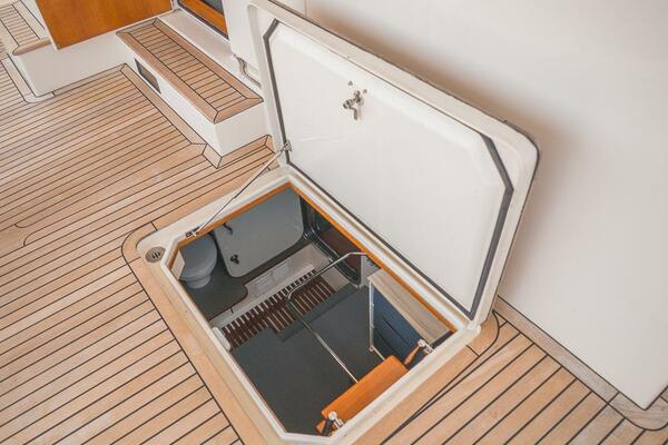 - Fitted workshop, fully finished with workbench, storage, sink, vise, tool storage, refrigerator. Entry through aft deck seat.