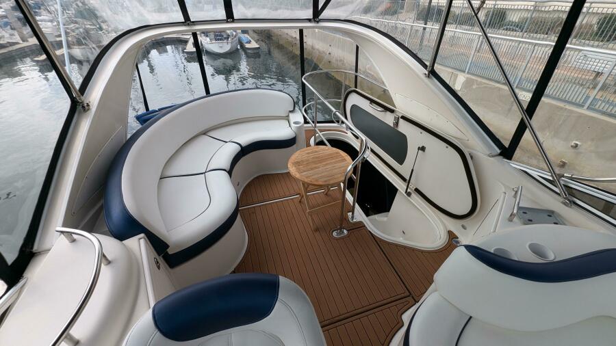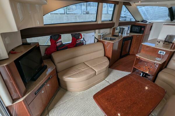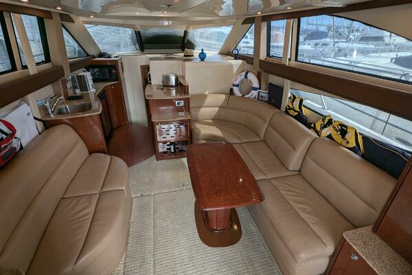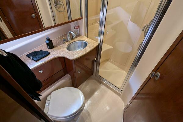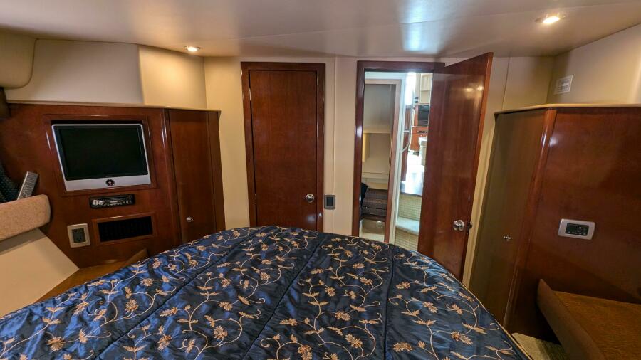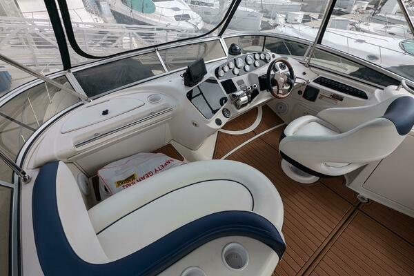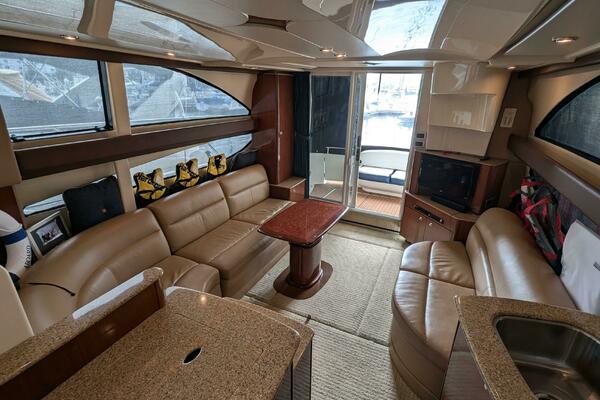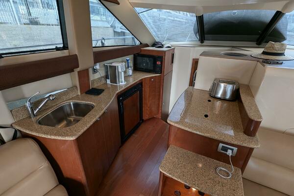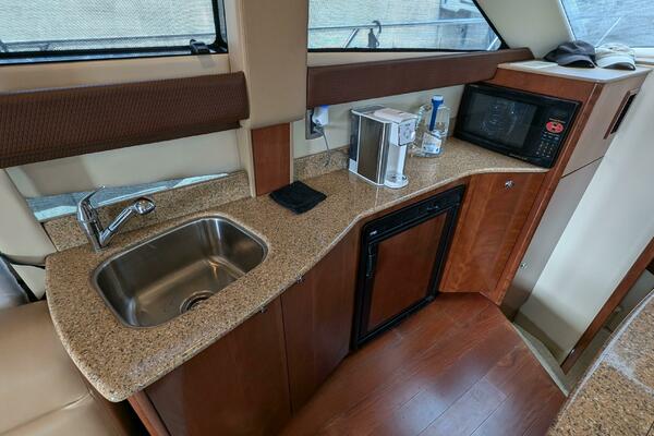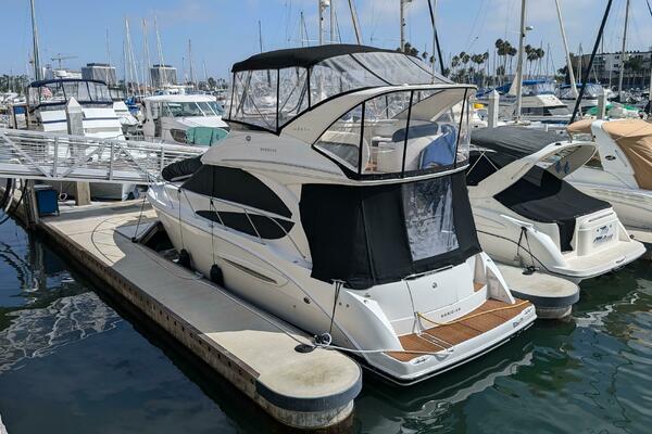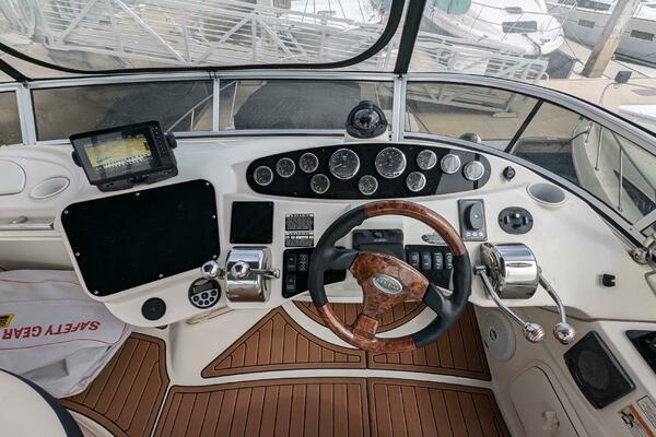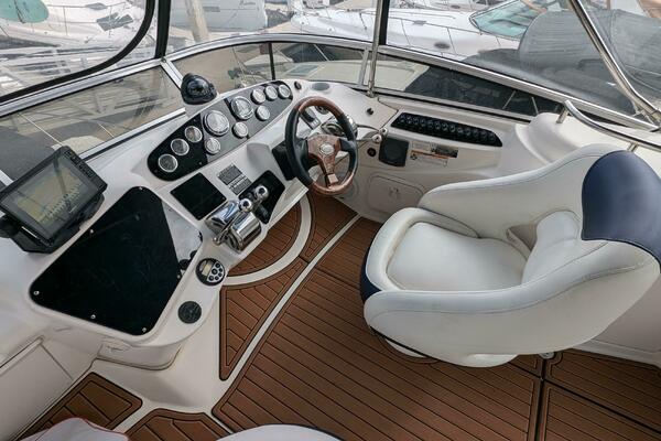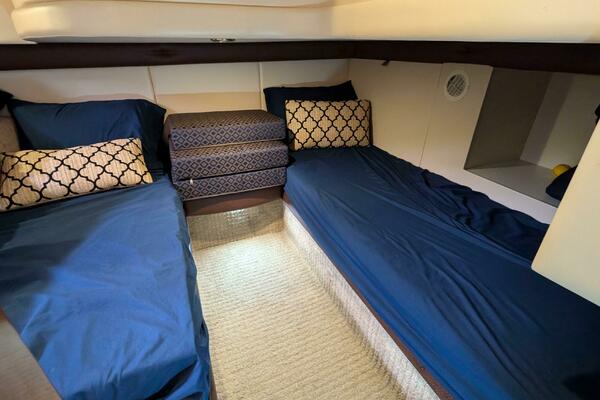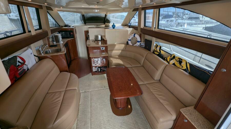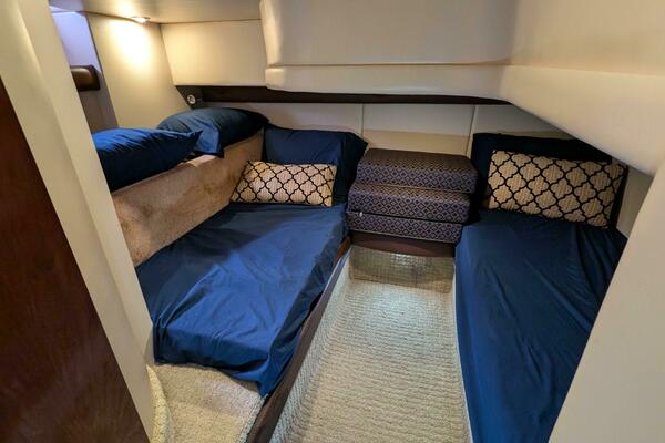 The Meridian 341 Sedan is a flybridge sedan with a remarkable amount of space for her size. Inside, there are two staterooms, and a pull-out sofa providing accommodation for six people; A salon with port & starboard seating that can seat six; A head with separate shower stall; and functional galley.