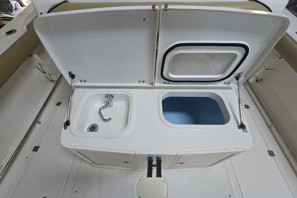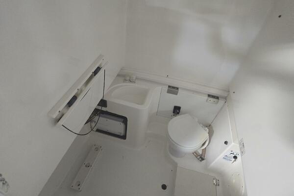 - Walk-in console with a marine head, sink, and pull-out shower.