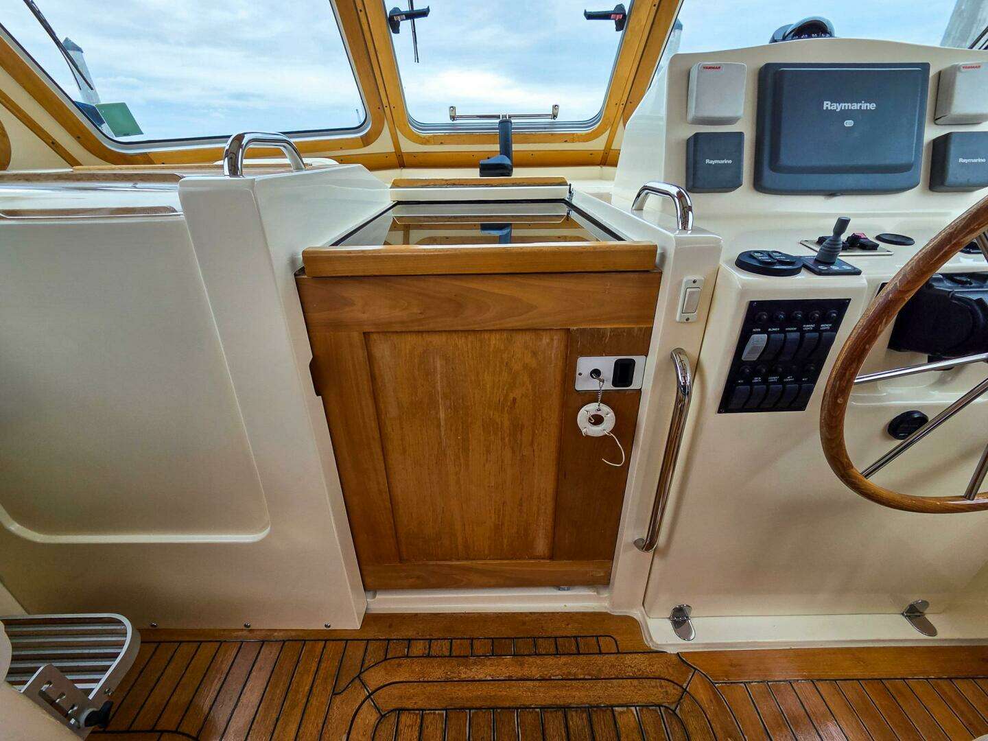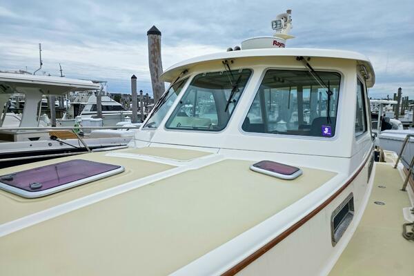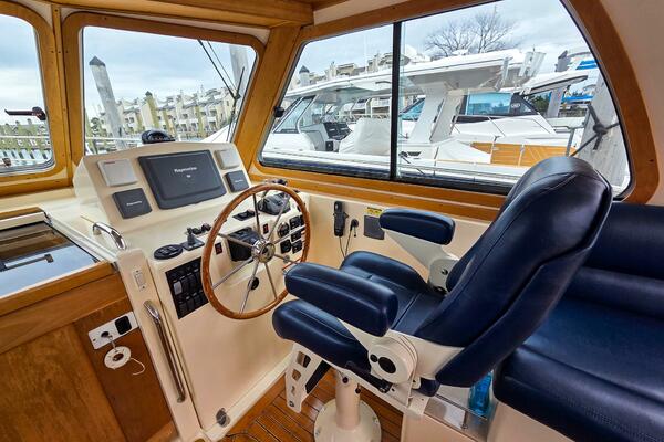 Key features include a spacious hardtop for protection, a galley down layout with good visibility, and a comfortable interior cherry wood joinery, a queen berth, and an enclosed head with a separate shower.