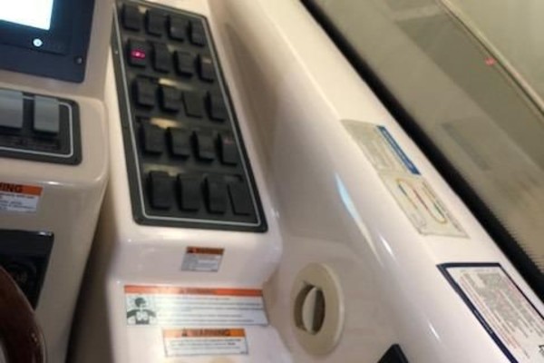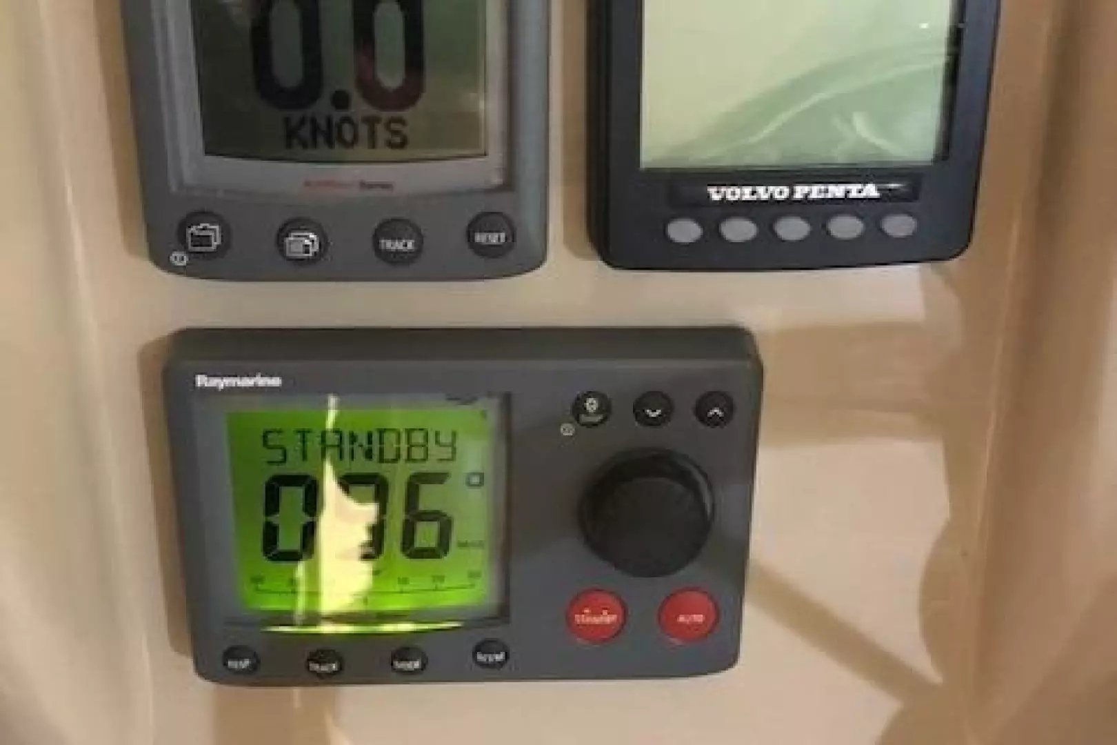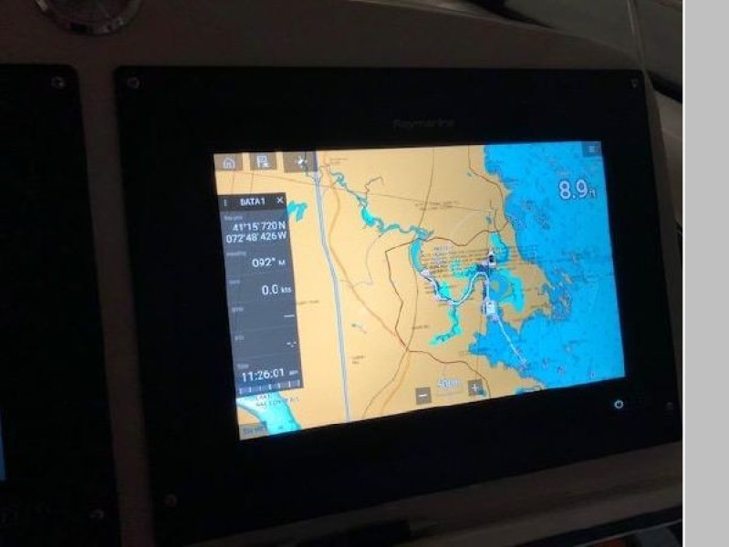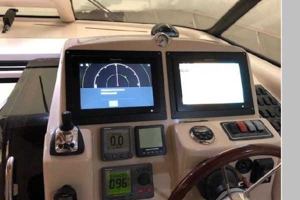 You then enter an open cockpit featuring wrap-around seating and a cocktail table that makes for the ideal entertaining space while dockside or on the hook. Halcyon's light earth tone upholstery gives off a classy yet inviting look. Stepping up onto the helm deck you'll pass through a new Isinglass sliding enclosure. The temperature-controlled helm deck serves as an ideal refuge from the outside weather while cruising or enjoying company for evening cocktails. The large elevated L-shape seating to port extends the length of the deck and provides ample space for guests. An on-deck refrigerator is located aft of the handsomely appointed helm station. At the helm, a pair of user-friendly new Raymarine Axiom series displays (2020) make navigating a breeze. With the joystick control, you will maneuver Halcyon with confidence while docking or departing at any port.