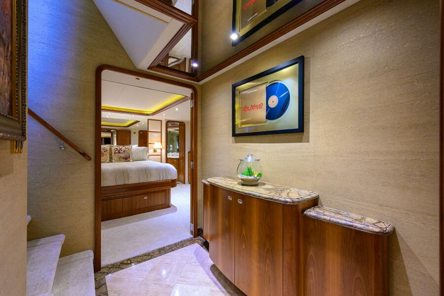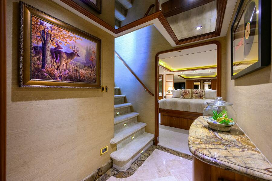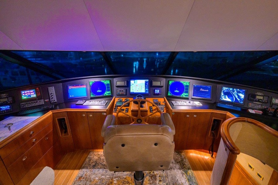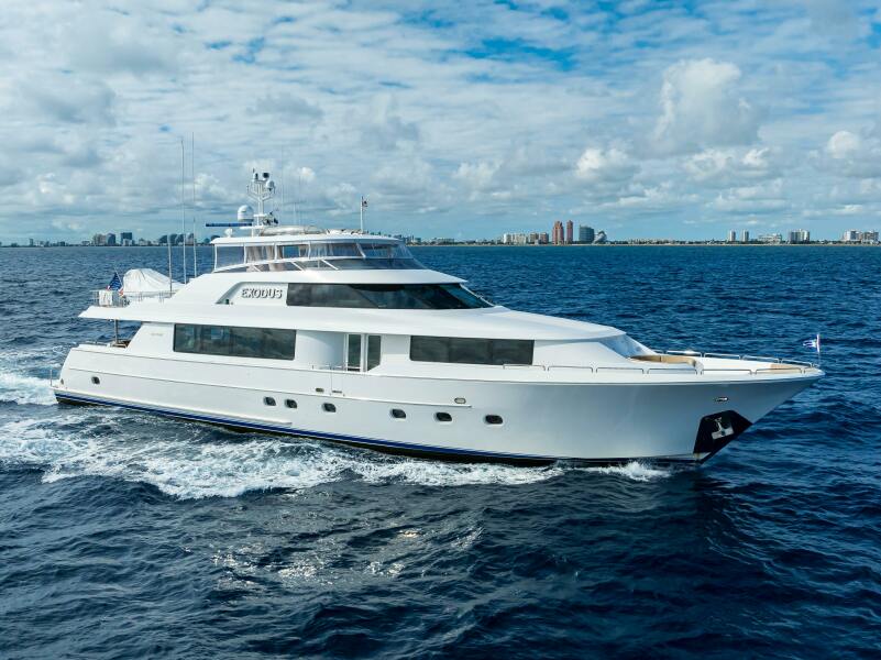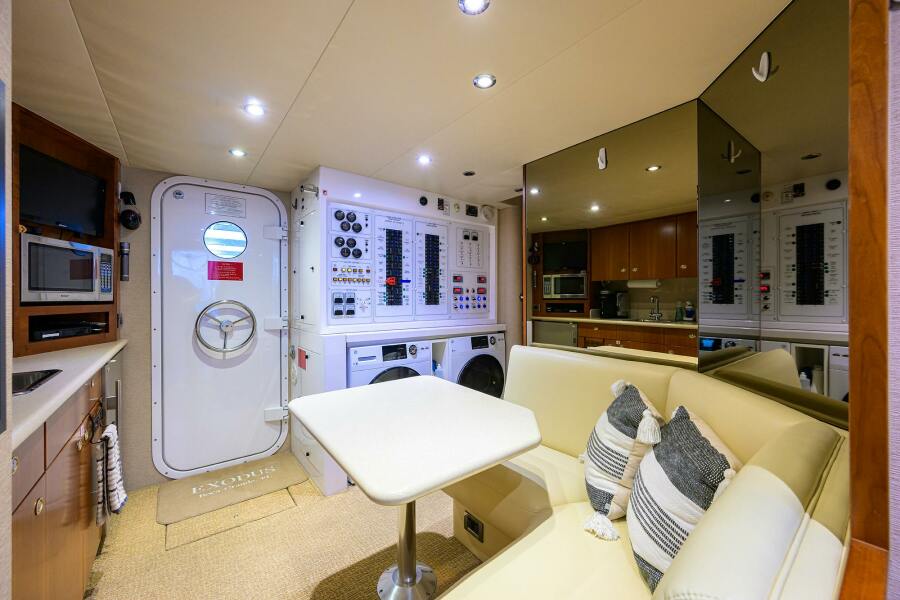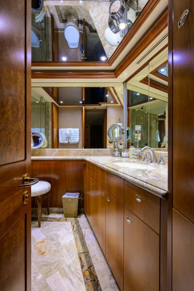 In 2023, EXODUS completed a yard period at Roscioli Yachting Center, during which the bottom and running gear were serviced, stabilizers were dropped for maintenance, and chillers were rebuilt, among other upgrades. She has received ongoing maintenance throughout 2024, placing her in optimal condition. Her guest accommodations reflect very light use while her interior design showcases classic Satin Cherry woodwork complemented by marble countertops and flooring. Much of the furniture is not fixed, allowing for modifications to suit the new owner's personal taste. With light use and exceptional maintenance, EXODUS represents great value in a quality and versatile motor yacht.