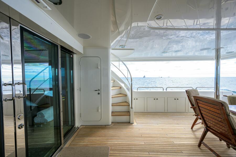 The exterior styling of EXODUS is sleek and timeless. The flybridge features a wet bar with a solid surface white sink and granite countertop, icemaker, refrigerators, and three bar stools. There is a hydraulic-powered Nautical Structures crane with a 2,000 lb. load capacity and removable chocks for a tender. Additional amenities include Stidd Low Back Helm chairs, a Kahlenberg air horn, a hot tub with a sunpad top and storage below, a molded settee with cushions and hinged seating for storage, and teak decking under the hardtop area. The flybridge also boasts a teak table at the settee, stainless steel table base, JL Audio speakers, and port and starboard wing stations with full controls. EXODUS’ exterior spaces are primed for entertainment and relaxation.