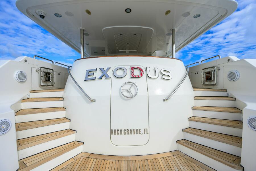 EXODUS can comfortably accommodate up to eight guests in four staterooms, with the master suite featuring a California King berth, upholstered headboard, a 15-drawer dresser, a walk-in wardrobe, opening port lights with screens and privacy covers and a TV with surround sound. The VIP cabin offers a queen berth, a walk-in cedar-lined wardrobe, a custom upholstered settee and a flat-screen TV. The portside guest stateroom features a queen berth, a cedar-lined wardrobe, opening port lights, an entertainment center with cherry doors and a flat-screen TV. The starboard side guest stateroom mirrors these amenities, and each cabin is complemented by an en-suite bathroom.