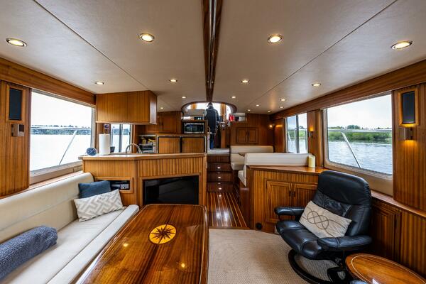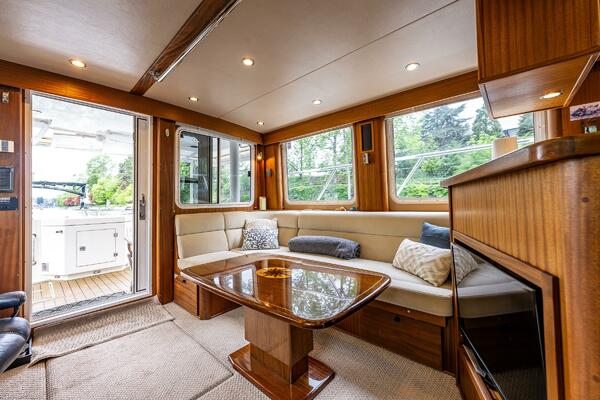 The 49PH is a very accommodating trawler, offering an open and bright main salon with both an on-deck u-shaped galley & dinette, easy to access pilothouse with port & starboard sidedeck sliding access doors, a midships owners suite and a VIP suite with private ensuite access to the guest head. A few of the great features of the 49PH is the spacious bridge deck that allows the owner to carry large tender and also have room for adventure toys such as kayaks and paddleboards, the smartly designed lazarette with built-in shelving and a large aft cockpit with a new Barrett enclosure.