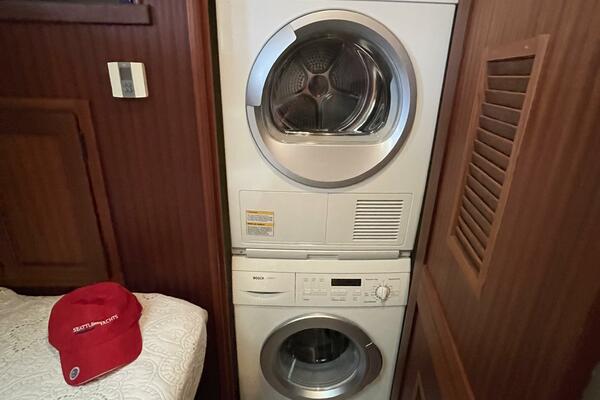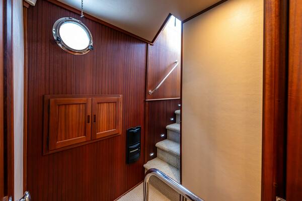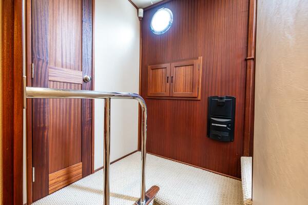 The foyer is just a couple of steps down from the pilothouse, featuring newly carpeted flooring, the trawlers central vacuum system, skylight with screen, storage cabinets, CO detector and LED lighting. A nice feature is the main overhead light is motion activated, so you can leave the light switch on and if you get up in the middle of the night to check something in the trawler, the light will illuminate.