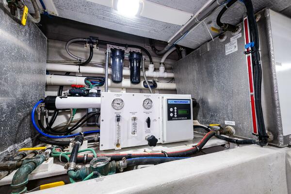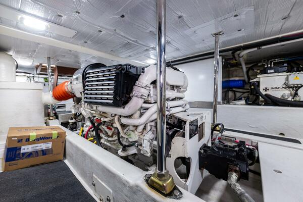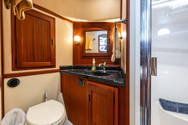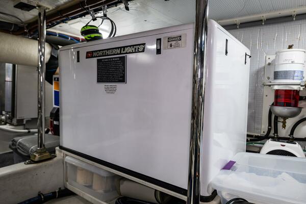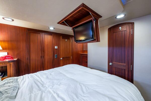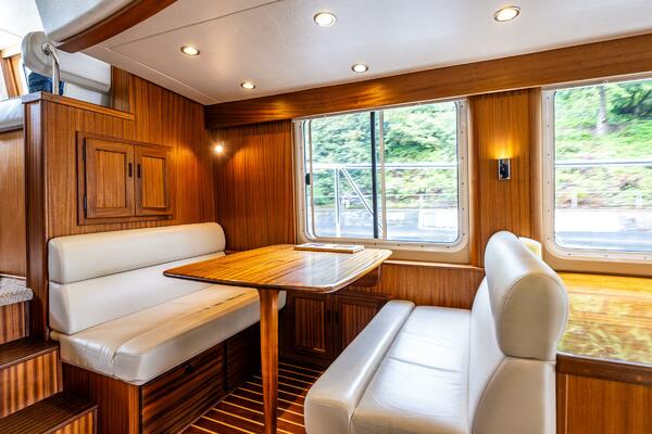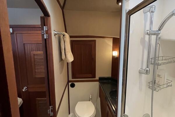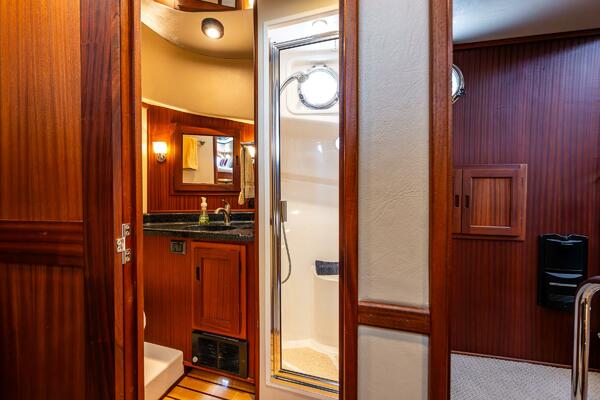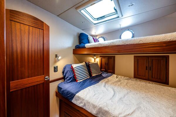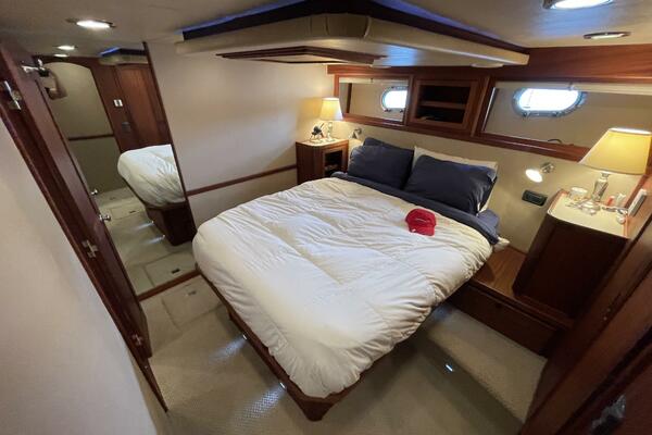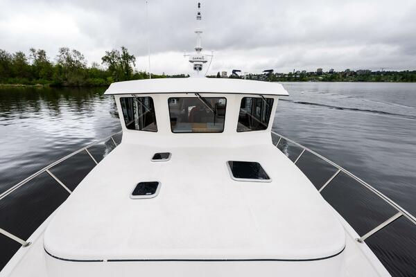 The foredeck offers easy to maintain non-skid decking, stainless steel safety railing, Muir hydraulic anchor windlass with 400' of chain, dual anchors, a deck washdown system and large stainless steel deck cleats. Getting to the foredeck is easy from either the port or starboard pilothouse doors or from the aft cockpit via the comfortable sized side-decks with waist high stainless steel safety railing.