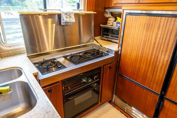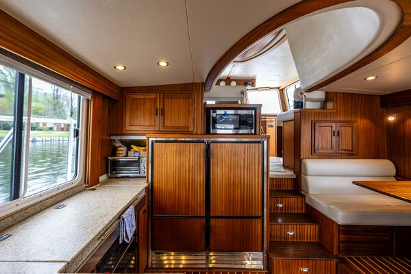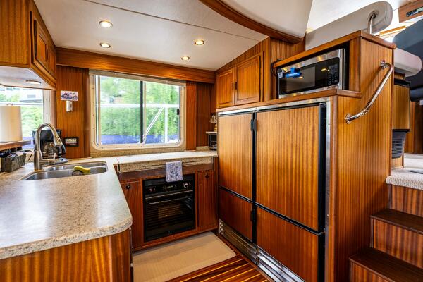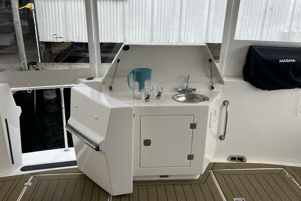 The large cockpit features a new deck enclosure by "Barrett Eclosures" (March 2025), a beverage center with stainless steel sink, engine/transmission/steering controls, Magma stainless steel BBQ, simulated teak decking, 2X Scotty downrigger bases & DC outlets, a flybridge access ladder & hatch, lazarette deck access hatches, stainless steel mooring cleats, transom shower, deck courtesy lights, raw water deck washdown spigot and a transom door leading to/from the swim platform. The swim platform offers a non-skid deck finish, swim ladder and stainless steel safety railing.