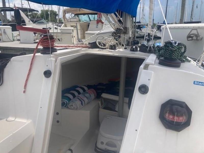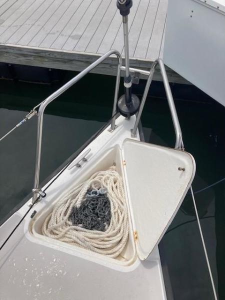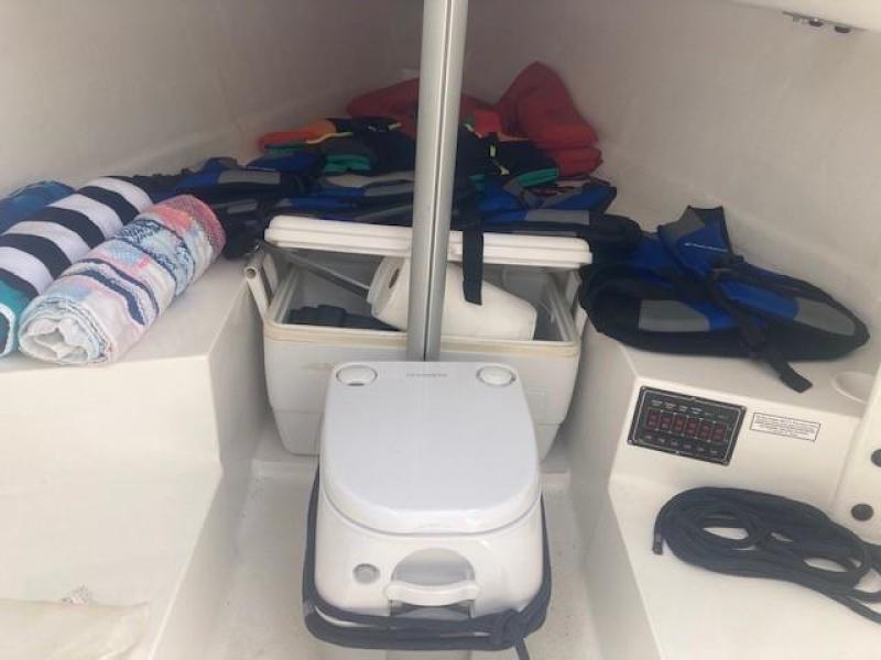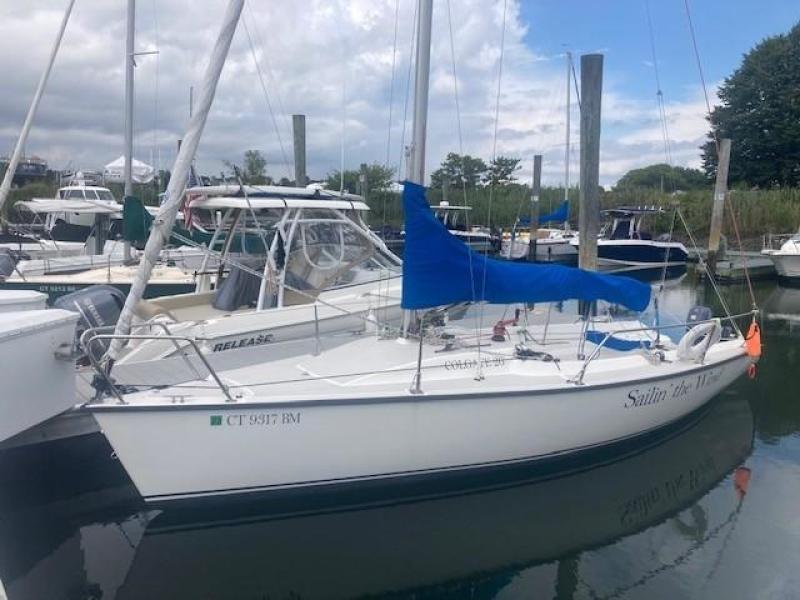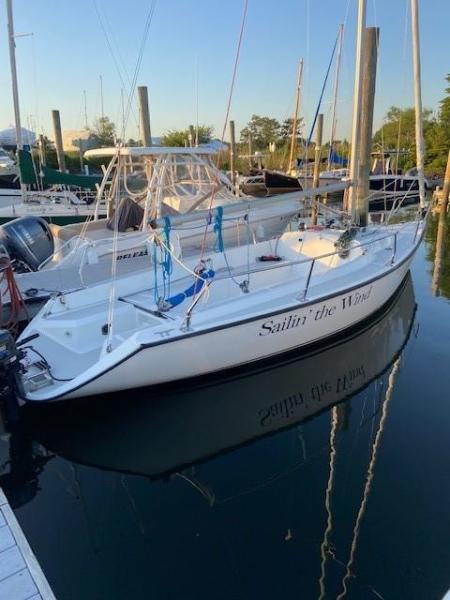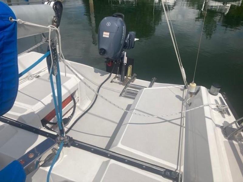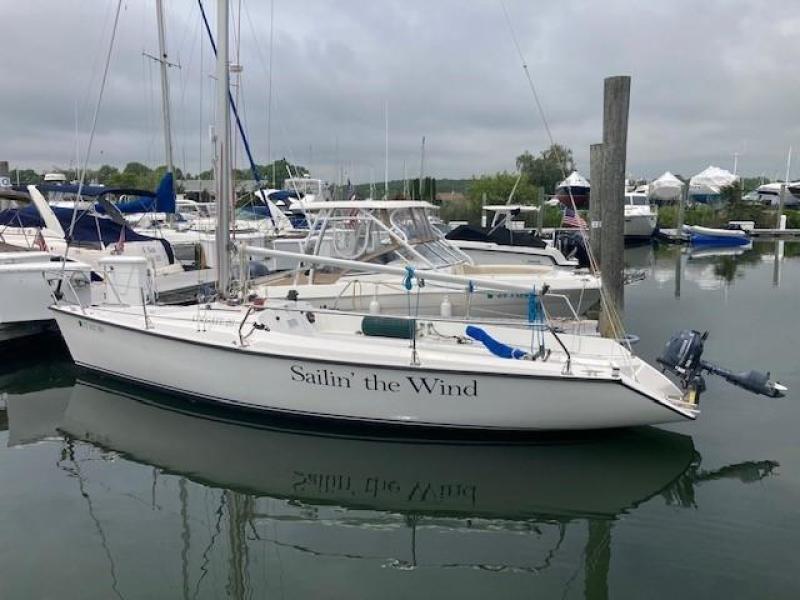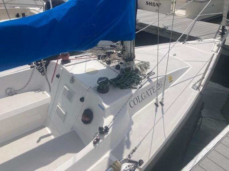 The well regarded Colgate 26 is well balanced and performs wonderfully whether in light or strong air. In heavy air the main the main has double reefs (a feature rarely found in boats on this size). You can sail her with either just the jib or just the main. The jib has Harken roller furling and all controls for main and jib lead back to the cockpit. There is a symmetrical spinnaker making it easier to handle on downwind legs. The cockpit has plenty of seating. Inside the cabin is a porta-potty and room for two bunks (there are no cushions). The boat comes North Sails main, jib, genoa and spinnaker, anchor and rode, VHF radio, a 2020 Four stroke Yamaha 6hp outboard motor and a galvanized Triad trailer.