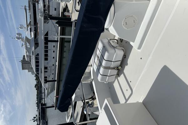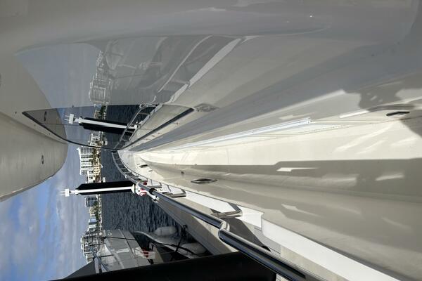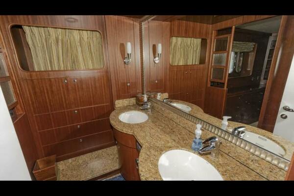 VIAGGIO accommodates six guests in (3) staterooms plus crew cabin aft. She features rich high gloss cherry joinery throughout and is complemented by the soft creams interior furnishings and accents. The full beam master is spacious and features queen-sized berth, large bath w/dual vanities, walk-in closet, vanity/desk and entertainment center. The VIP stateroom is located forward with a queen- sized berth, and a double berth stateroom to starboard with a sliding berth can be converted to twin berths. The two aft staterooms share a well-sized guest bath with a large shower. The spacious salon features built-in settee's, sofa, tables and entertainment center. Forward to starboard is the gourmet galley open to the salon with granite counters and hardwood planked sole. A raised leather dinette with U-shaped leather seating is forward. The aft deck is shaded and has a dining area with teak table and the foredeck has sun pads. The air conditioned flybridge features a full helm station, seating/dining area, wet bar with BBQ and a low profile davit located aft.