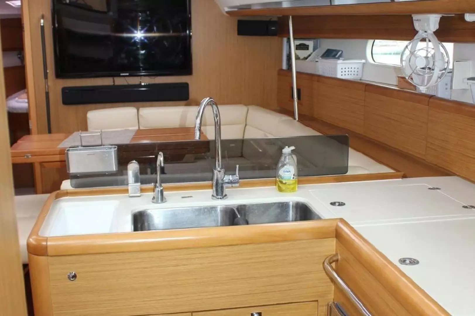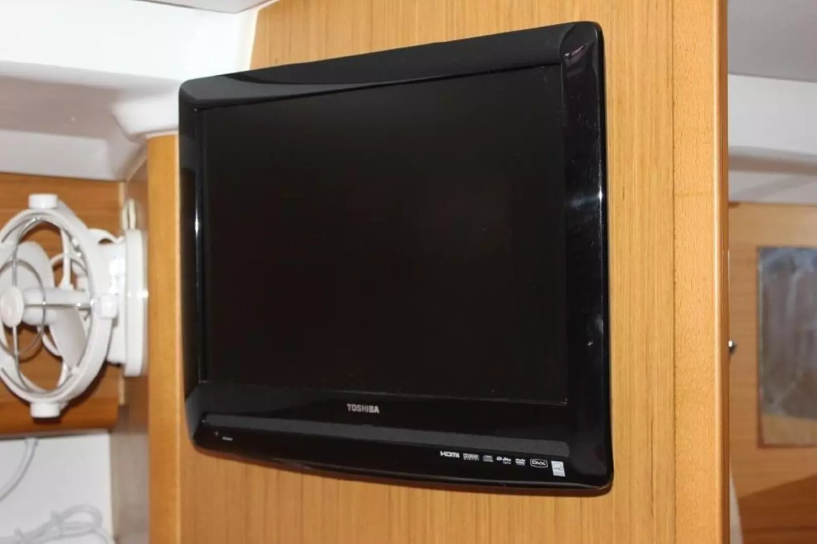 Flat-screen TV on fwd salon bulkhead w/custom S/S mount
