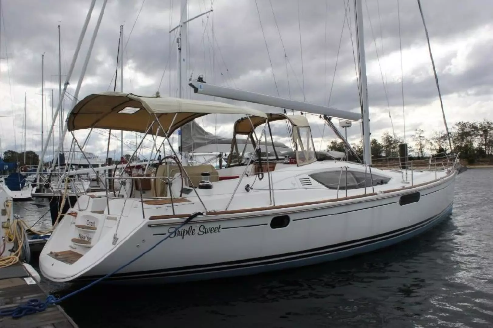 The 50 DS is great for coastal cruising and is quite capable of crossing an ocean. Moderately light displacement helps make it fast in light winds, while her construction makes her capable of getting to the next port in fine style no matter what the weather. With her in-mast furling main, furling genoa, new Quantum carbon fiber sails, Harken electric winches mounted near the helm station and shoal draft bulb keel Triple Sweet is a great boat for shorthanded voyagers. Her optional bow thruster helps making docking easier under windy conditions and she has a voluminous sail storage lazerette forward with a full-height ladder for access. Triple Sweet has the classic layout with the master cabin forward and two guest cabins aft. The bow cabin has an ensuite bathroom and the boat's day-bathroom is alongside the companionway to port. She has a roomy salon, cabins and bathrooms, as well as abundant storage space, a big comfy navigation station, large galley and dining area and 2-zone air conditioning/heat. Triple Sweet has many upgrades and options that set her apart from other 50 DS's. Her Check out the Full Specs and call for an appointment for a viewing.
