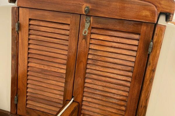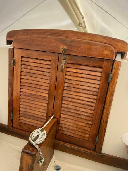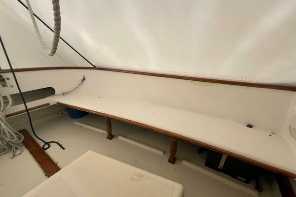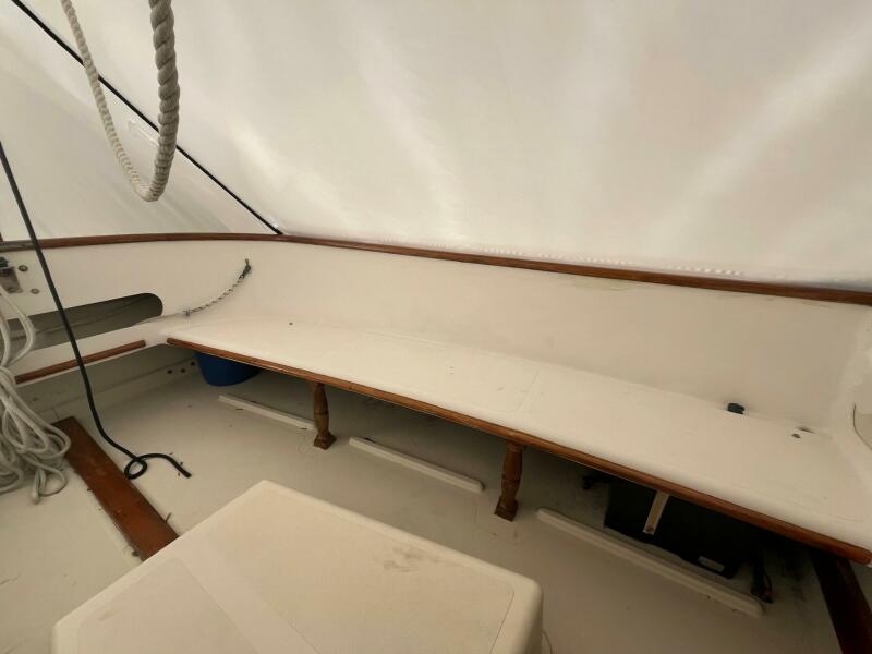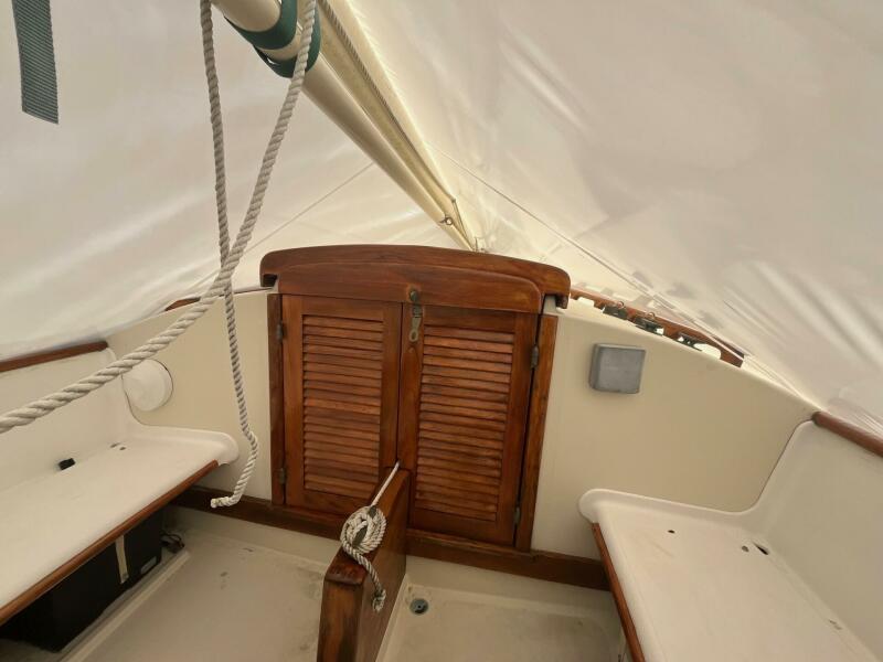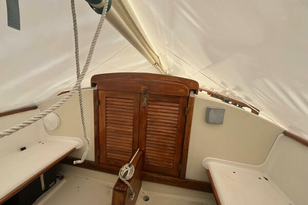 The Sanderling has 2 settees below that make 2 large berths.There are shelves mounted outboard of the berths. A self contained marine head plumbed for pumpout is included. The shallow draft centerboard design allows exploring small coves and inlets.