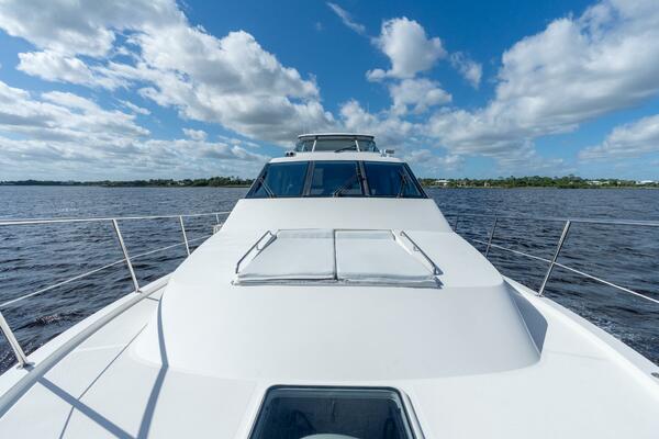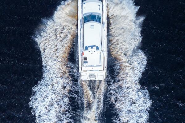 - Large flybridge with hardtop, bar area, grill, and tender storage aft