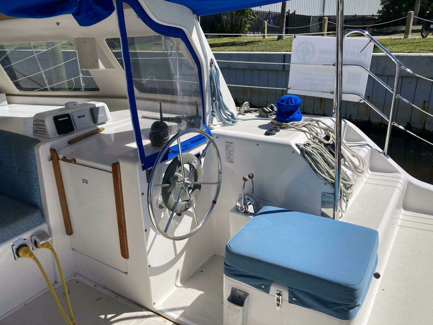 Stepping up to the cockpit, there is a stainless arch aft with solar panels located above, seats located port and stbd, and a central gas grill. Propane bottles are located underneath the seats, and a main sheet traveler is located at deck level. A tender davit system with blocks and tackle is located behind the arch. There is a stainless framed bimini top and extension panel that meets the aft arch located above. Port and stbd helms are located aft of the house with the stbd side having the engine controls and electronics. Seats are located at each helm with opening lids to access the outboard engines. All Halyards and sheets are lead aft to the cockpit for ease of sail handling, with two speed winches located on the cabin top, and winch handles in pockets at the helm seats. The cockpit is spacious due to no fixed table in this area.