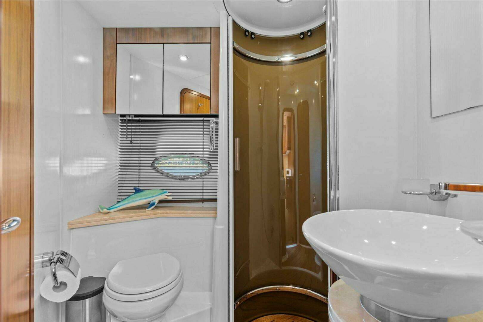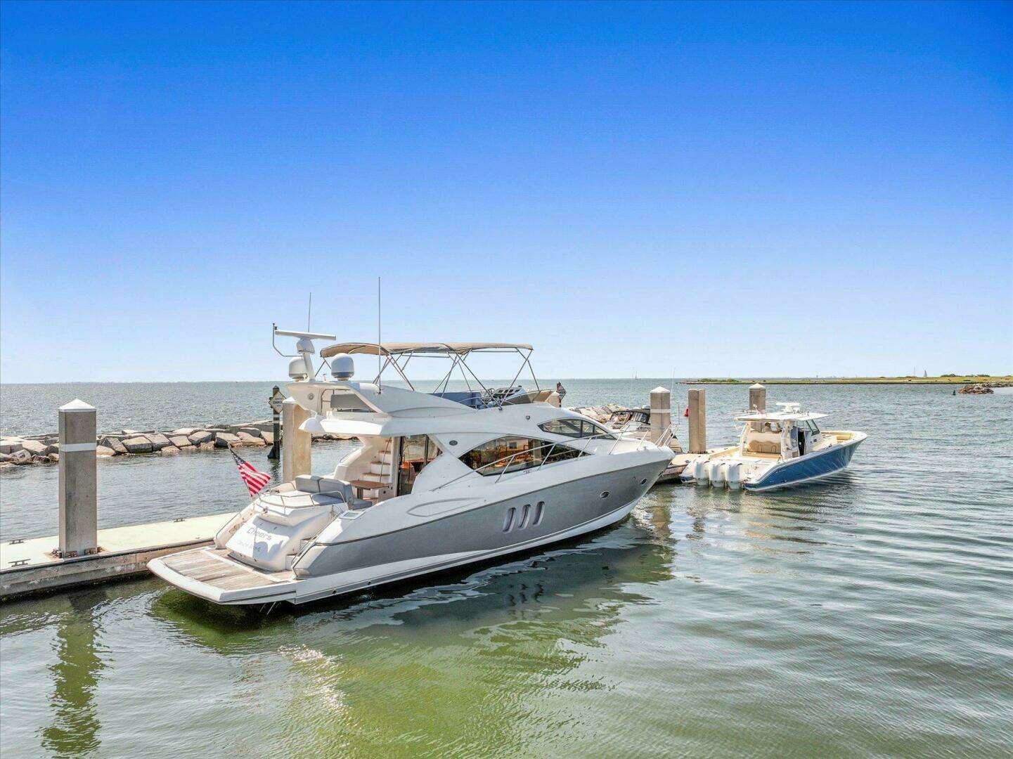 Cheers stands out with her painted hull, hydraulic swim platform, and custom dual helms fitted with triple Garmin plotters for effortless navigation. Bow and stern thrusters make docking smooth, while her custom extended flybridge Bimini, stainless-steel anchor, and included (never used) Isinglass enclosures make her ready for cruising in comfort.