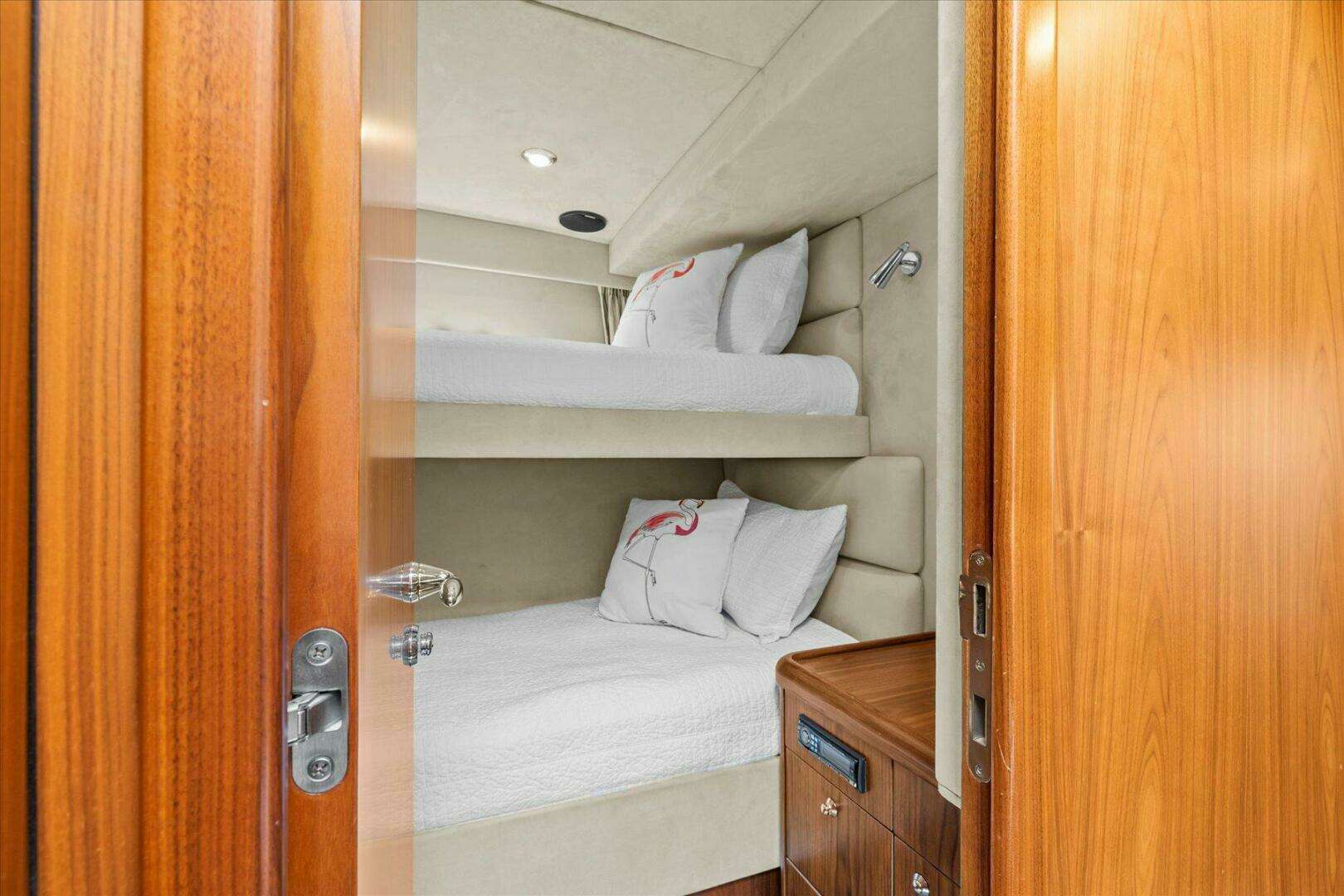 Recent upgrades include a full gelcoat polish and wax, fresh bottom paint, new galley A/C, serviced engines and generator, and refinished high-gloss interior tables. Her updated soft goods, luxury-grade carpet, upgraded audio system, and thoughtful electronics put her in turnkey condition.