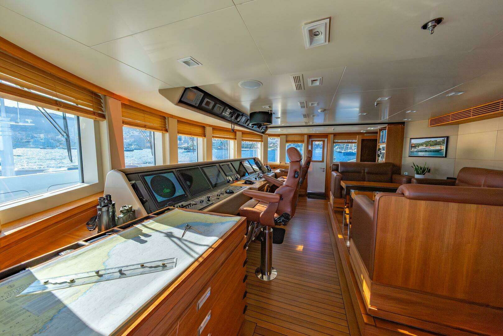 Storage for charts and publications is abundant, and the navigation suite is extensive, with a 42-inch chart display, well-considered redundancy across the electronics, a full GMDSS outfit, and three ECDIS systems. A partial equipment list follows: