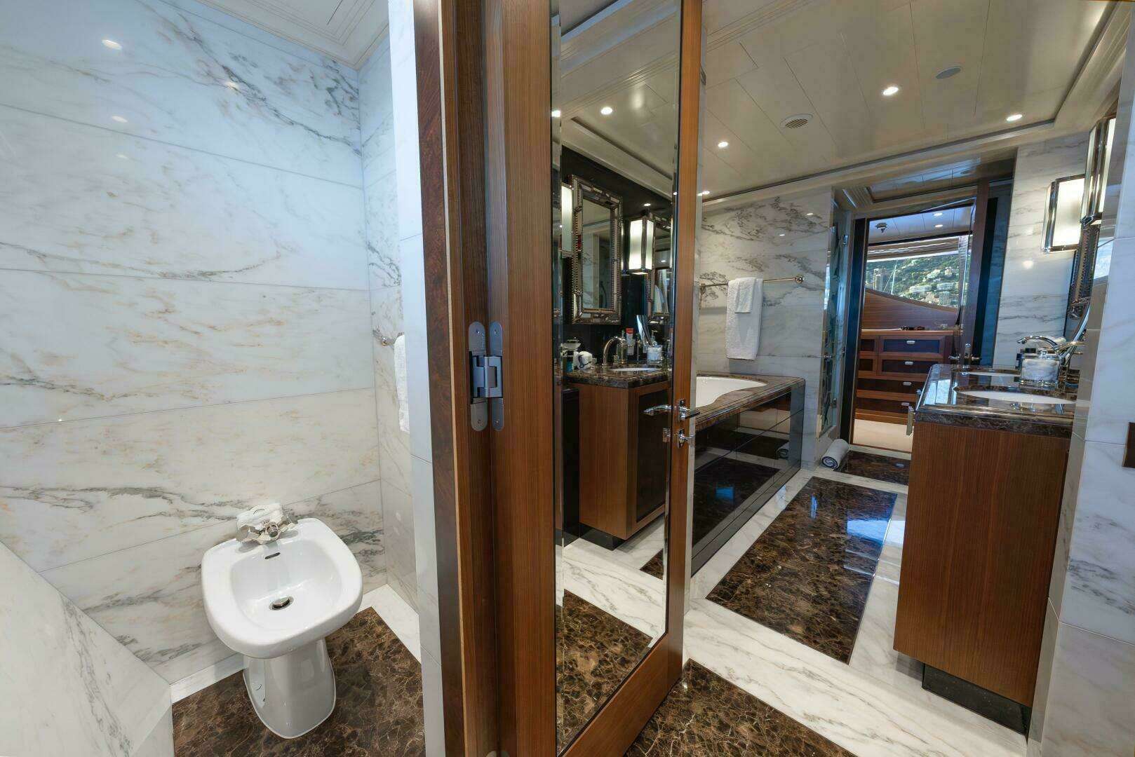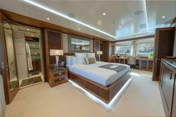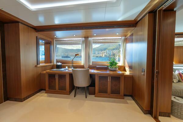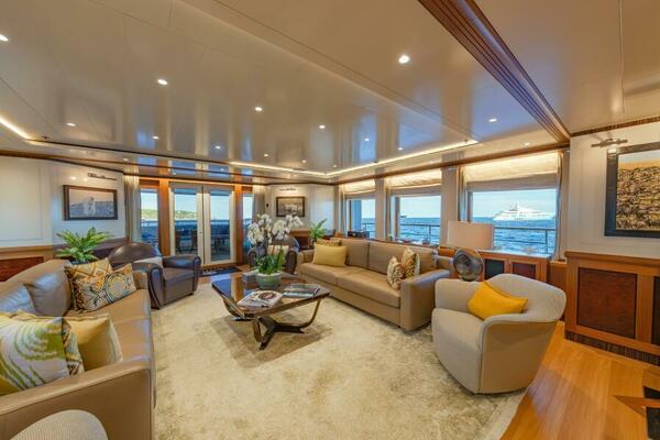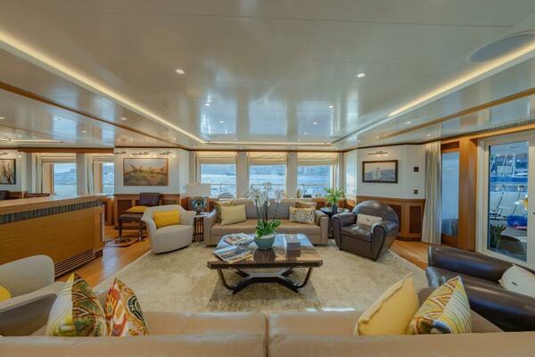 Beyond her mechanical pedigree, LATITUDE offers a guest experience that rivals yachts far larger. The sundeck is a signature space, featuring a new jacuzzi and multiple lounging areas. Inside, the sky lounge serves as a true second salon, supported by a forward master suite with its own private movie room and four beautifully appointed guest cabins. The transformation of the aft lower deck into a dedicated aquatic sports center and mini beach club—with integrated Nitrox dive system, gear stowage, and a full-beam deployable swim platform—elevates LATITUDE well beyond other yachts. The result is a mechanically refreshed, elegantly appointed vessel, ready for serious adventure or relaxed family cruising with equal poise.