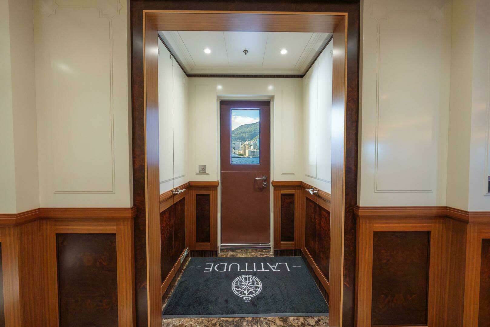 The pilothouse is accessible from three points: port and starboard exterior doors, plus an interior companionway. Those exterior doors showcase one of LATITUDE’s most thoughtful design details. On most yachts, watertight doors have visible “dogs”—the manual handles that secure the seal. On LATITUDE, the dogs are fully integrated inside the door itself and engage simply by lifting the handle. It’s a rare, elegant solution found throughout the boat that maintains the interior’s clean aesthetic while still delivering a proper watertight closure.