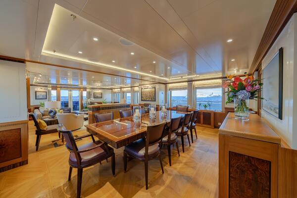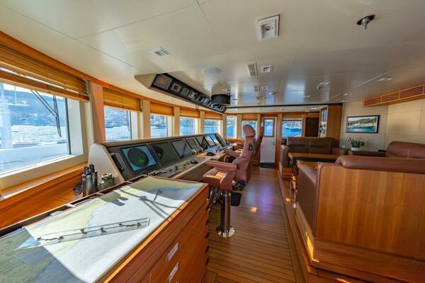 Inside, the pilothouse is designed for navigation and guest engagement. Polished teak floors and a generous seating arrangement in rich brown leather create a warm, elevated environment. Two tables provide a perfect spot for an owner or guest to stay in the action, enjoy a meal, or take in the view from arguably the best seat aboard.