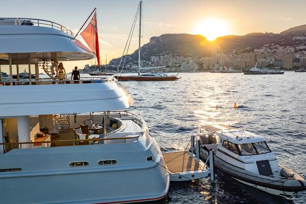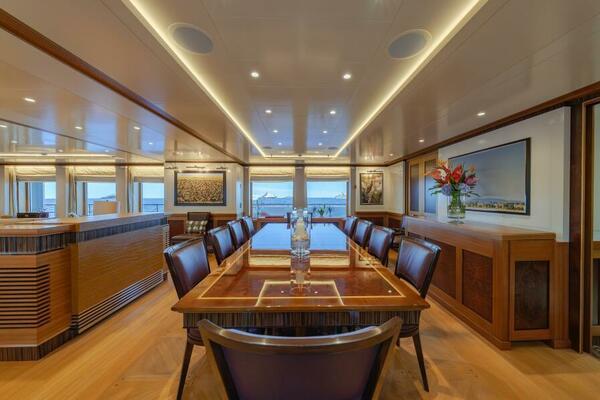 The bar is topped with solid varnished teak and fully equipped with a fridge, sink, dumbwaiter, and generous storage. A substantial counter aft of the bar serves beautifully for buffet service and could easily accommodate a permanent grill. Further aft, the custom 4 m RHIB rescue tender sits on its cradle; its crane can cleverly double as a buffet table when stowed.