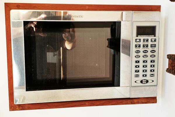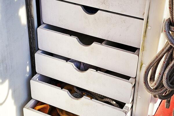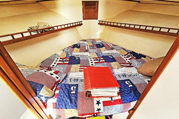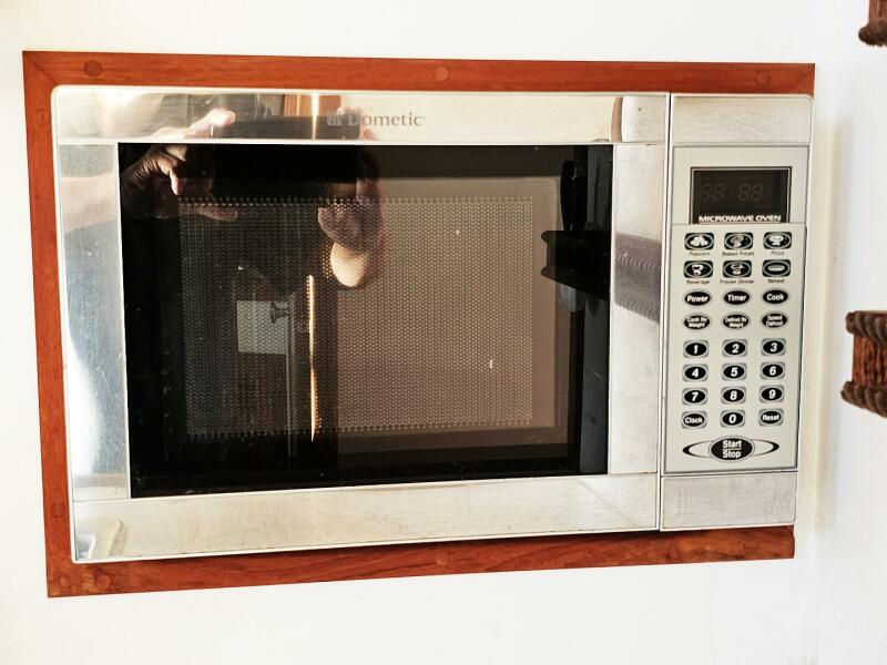 Moving forward and down 3 short steps to port is a compact galley. Within this space you will find a second refrigerator and storage beneath the counter, and on the counter there is a large single bowl stainless steel sink and a single burner glass top stove. Above the counter is more storage and a built in microwave oven. Just forward of this is a tall hanging locker that divides the galley from the V-berth on the port side.